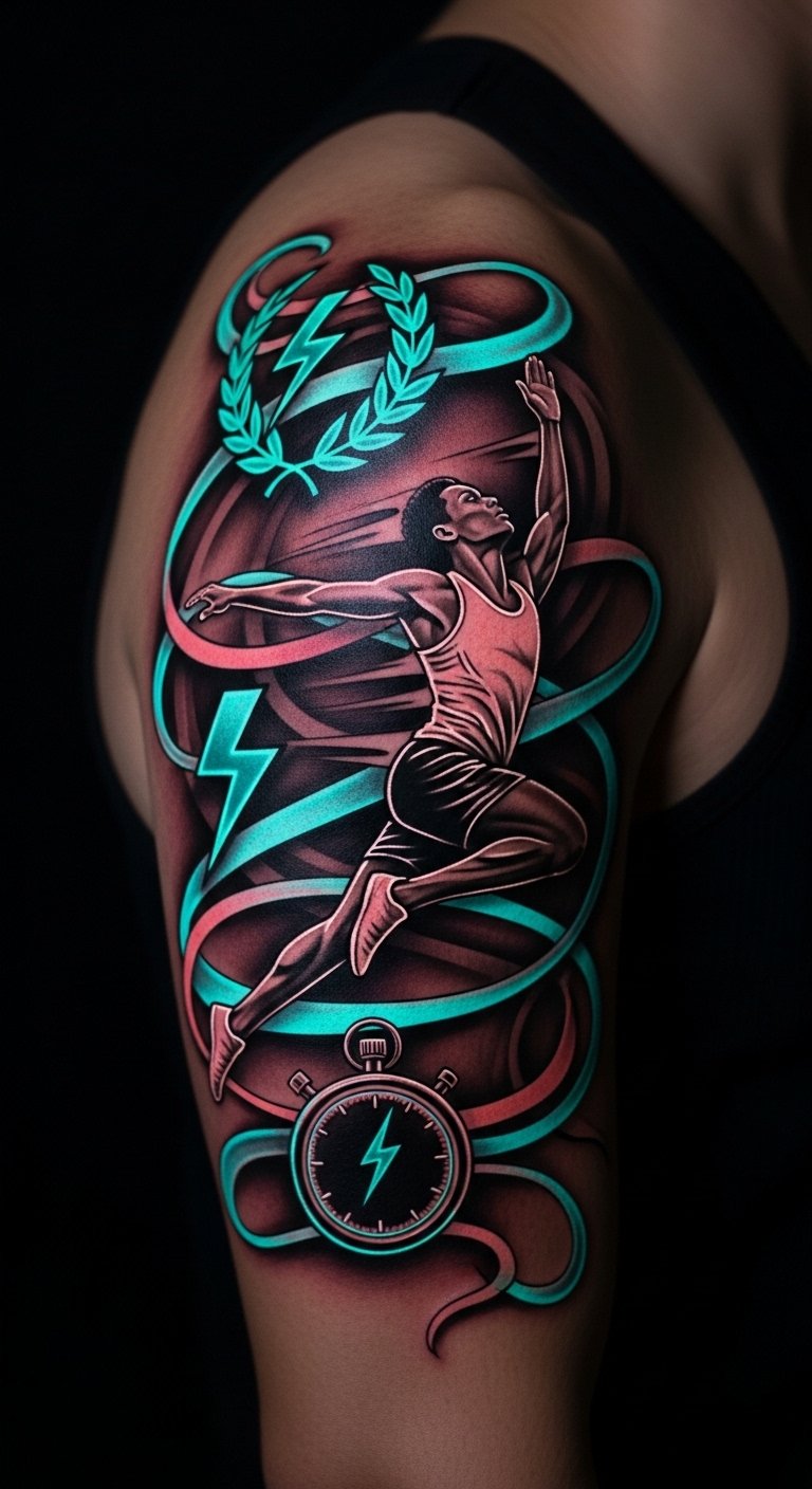 Imagine dynamic sports motifs like soaring athletes or bold athletic performance symbols glowing under black light, energizing your skin with passion.