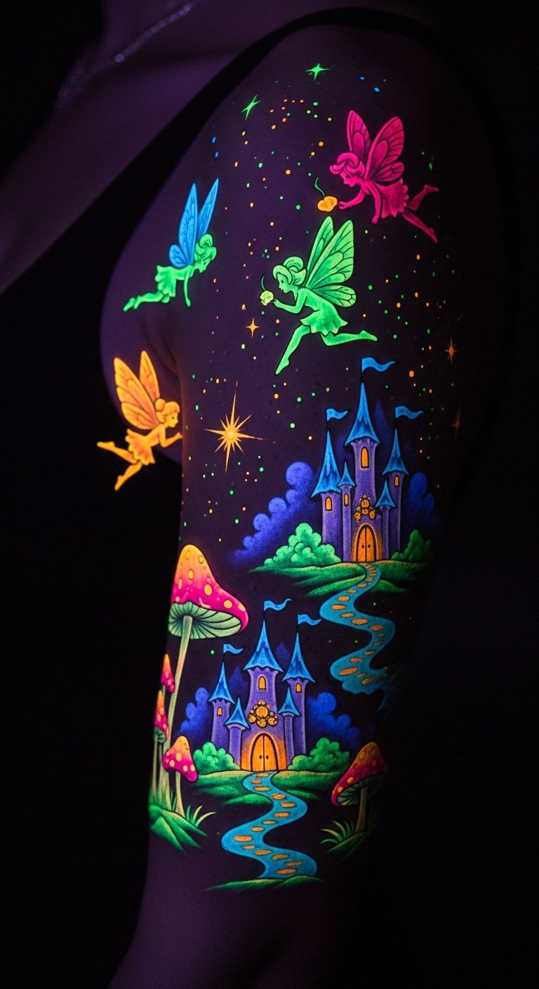 A sleeve or shoulder piece that layers delicate fairytale creatures—miniature foxes, moths, and sprites—amid winding ivy, tiny lanterns, and crescent moons rendered in UV-reactive inks; symbolism centers on transformation, guidance, and the inner child, evoking wonder and gentle protection.