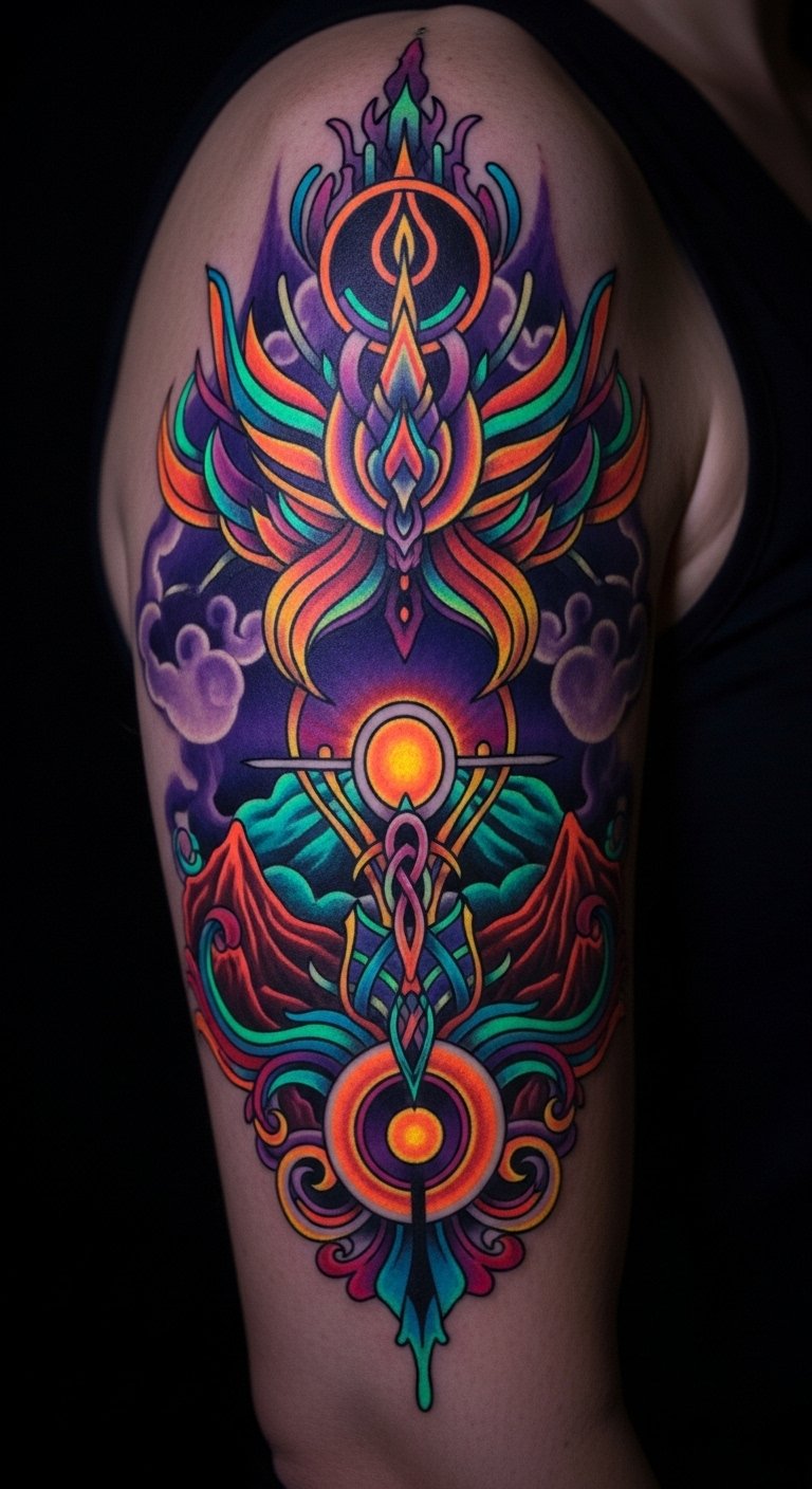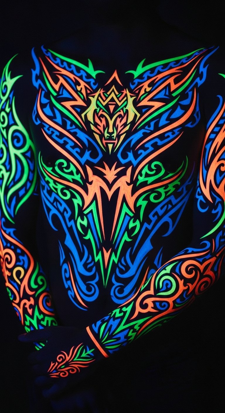 The UV accents evoke hidden energy and inner light, creating an emotional contrast between calm earthiness and otherworldly glow; placement across the mid-back to shoulder allows the piece to expand organically with body movement, revealing its luminous details under black light and serving both as a private talisman and a visible statement in the right setting.