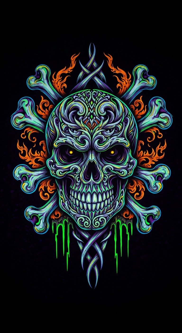 This design concept uses the original text as the visual foundation: a central ornate skull rendered with filigree bone patterns extending into anatomically inspired rib and clavicle motifs, high-contrast blackwork with delicate white highlights, and UV-reactive inks on select filigree and teeth to create a hidden glow. Symbolically it fuses rebellion and artistry—skull and bones representing mortality and bold independence, filigree indicating creativity and complexity, UV elements revealing an inner passion—evoking fierce confidence and a wild, fearless spirit. Ideal placement is a forearm sleeve for visibility and flow, upper chest for impact over the heart, or along the side ribcage to emphasize the bone motifs and movement under the skin.