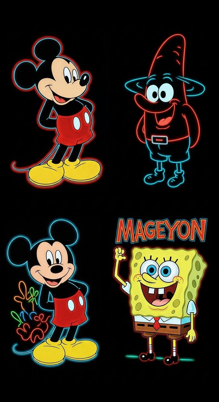 A neon-glow cartoon sleeve that channels playful nostalgia and electric energy—characters rendered in vivid cyan, magenta, and lime outlines with soft inner glows and subtle halftone shading, connected by flowing neon trails and starbursts to unify the composition; symbolically it celebrates childhood memories revived with bold modernity, evoking joy, wonder, and a luminous rebelliousness; ideal placement is a forearm or full sleeve where the animated movement can wrap the limb and glow under black light for maximum impact.