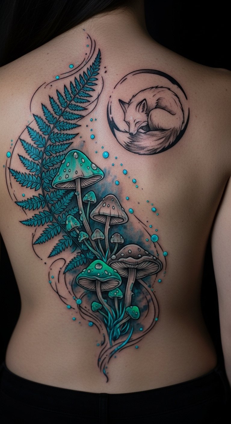 This design symbolizes a deep connection to the natural cycle—ferns for resilience, mushrooms for transformation, and the fox for intuition—while the crescent moon ties to renewal and quiet guidance.