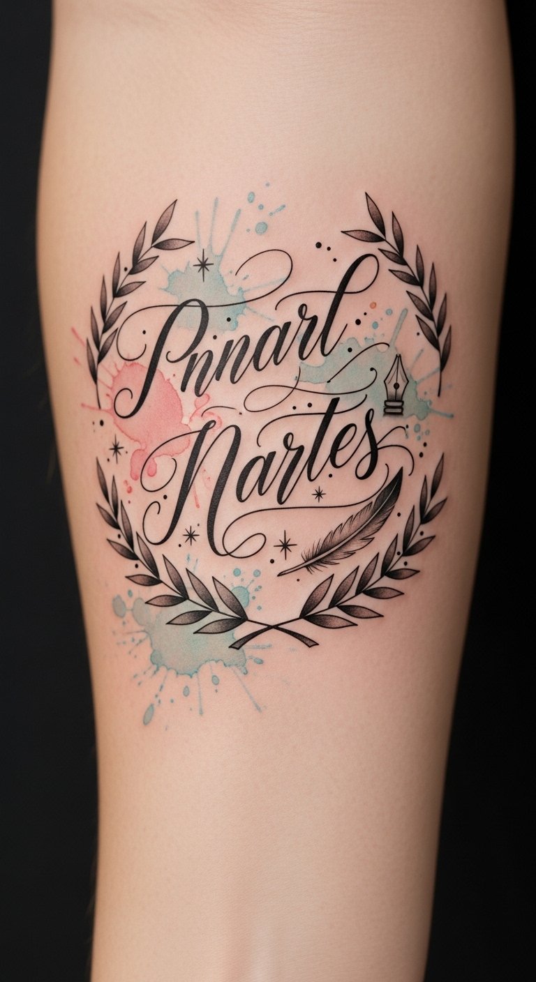 Creative slogans and whimsical wisdom transform your body into an artistic expression, celebrating your unique journey and freedom. The laurel wreath and quill symbolize honor and personal authorship of one’s story, watercolor splashes convey emotion and spontaneity, and stars suggest guidance;