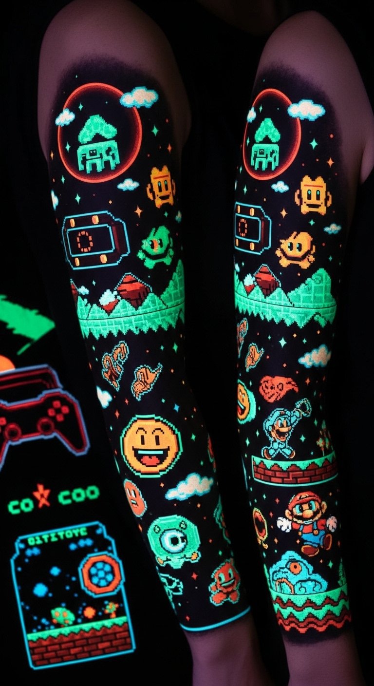 This design concept uses the original text as a direct visual brief: a black light tattoo panel featuring a horizontal scene of iconic 8-bit heroes and landscapes in vivid neon pixels—electric blues, hot magentas, acid greens—arranged like a retro game HUD with small animated elements (coins, hearts, stars) that appear only under UV. Symbolically it celebrates playful escape and the joy of simpler times; emotionally it evokes nostalgia, wonder, and liberation through color and light. Ideal placements are forearm or calf for a linear scene, shoulder blade or chest for a larger vignette, where the glowing effect can be shown off under club/party lighting or kept subtle in daylight.