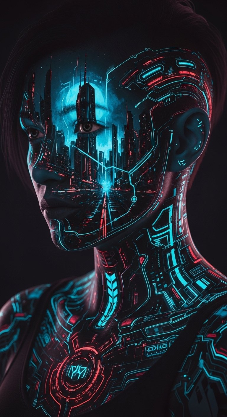 This design concept channels the original scene into a wearable tableau: layered circuit-line filigree and skyline silhouettes that curve with musculature, bioluminescent accents placed along veins and tendons to suggest energy flow, and modular implant motifs at joint intersections to imply augmentative function.