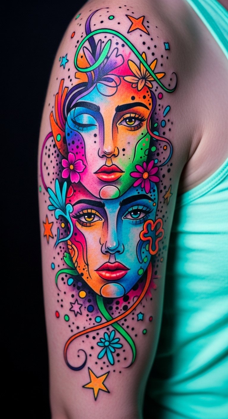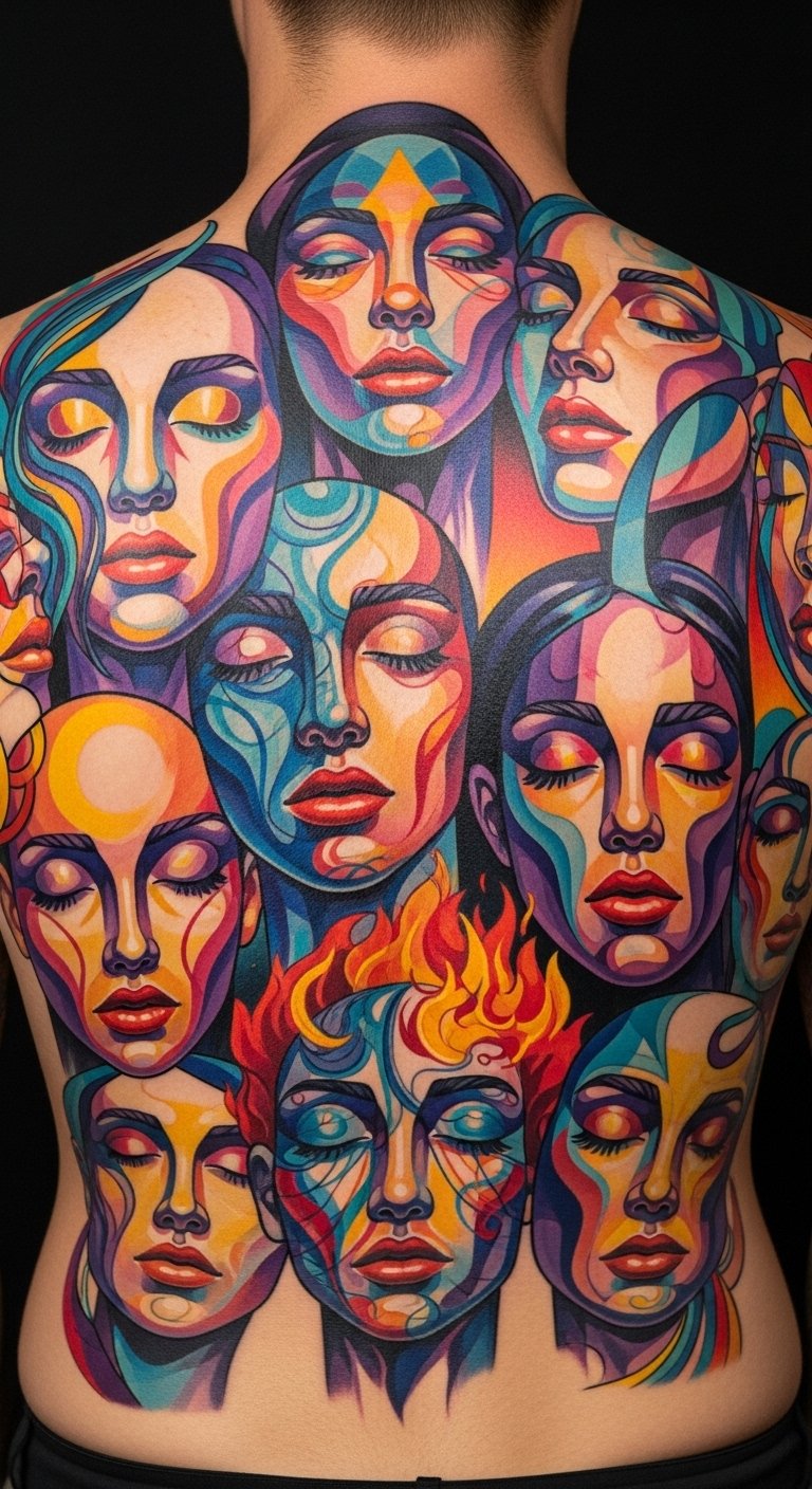 These designs use layered, flowing shapes and saturated hues to symbolize the complexity of inner life; overlapping faces represent multifaceted identity while bursts of color mark moments of intense feeling. Emotion is conveyed through skewed proportions, brushstroke textures, and gradients that move from cool to warm to suggest shifting moods. Ideal placements include the forearm, shoulder blade, or thigh—areas large enough for color transitions and visible when you choose to share the story, allowing the wearer to display different aspects of self depending on orientation and movement.