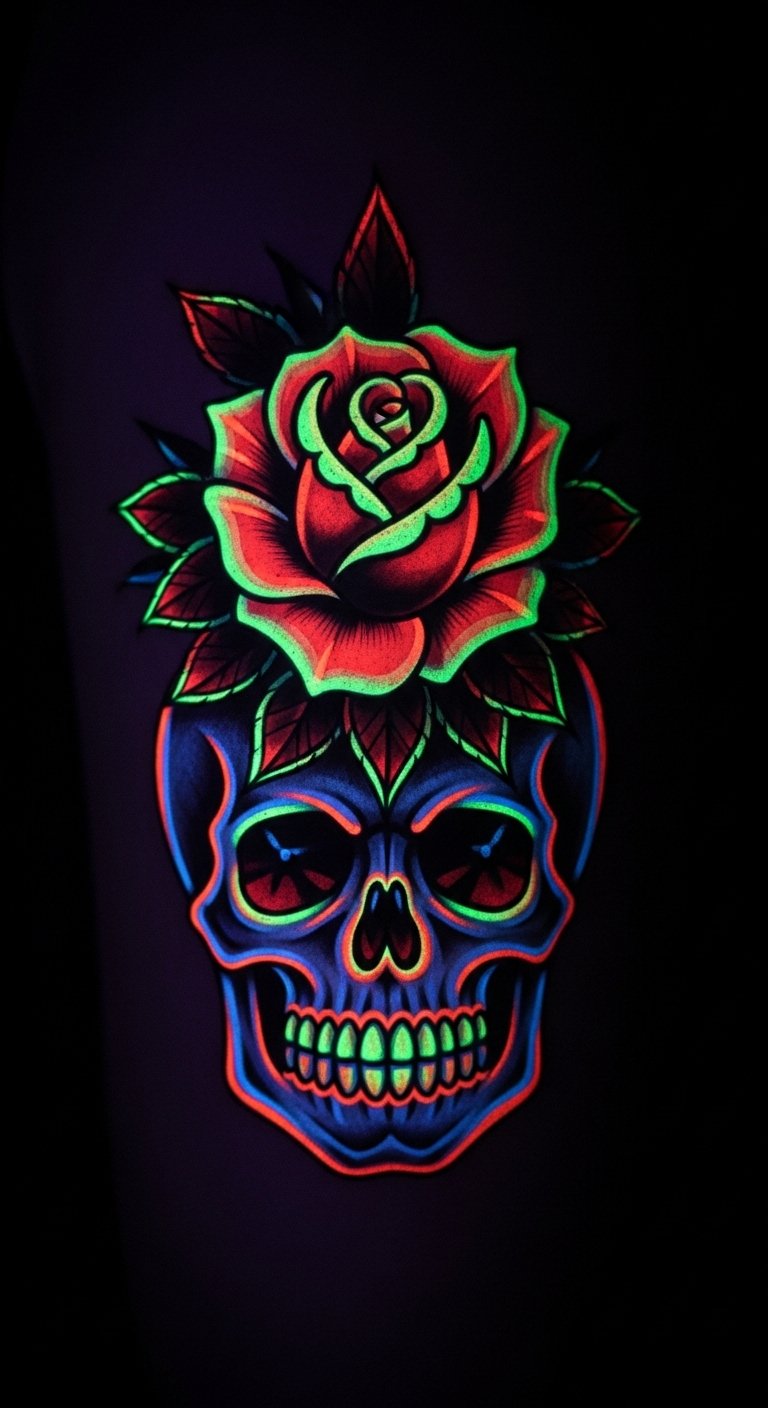 A design blending a traditional rose-and-skull motif rendered in bold black linework with layered UV inks that hide botanical filigree and micro-patterns visible only under black light; place on the upper arm wrapping toward the shoulder so the piece reads as a classic tattoo by day and blooms into luminescent detail at night. Symbolically this juxtaposition speaks to duality — life and mortality, seen and secret — evoking wonder and playfulness while offering a personal, intimate reveal when chosen placement allows the wearer to show or conceal the glowing elements.