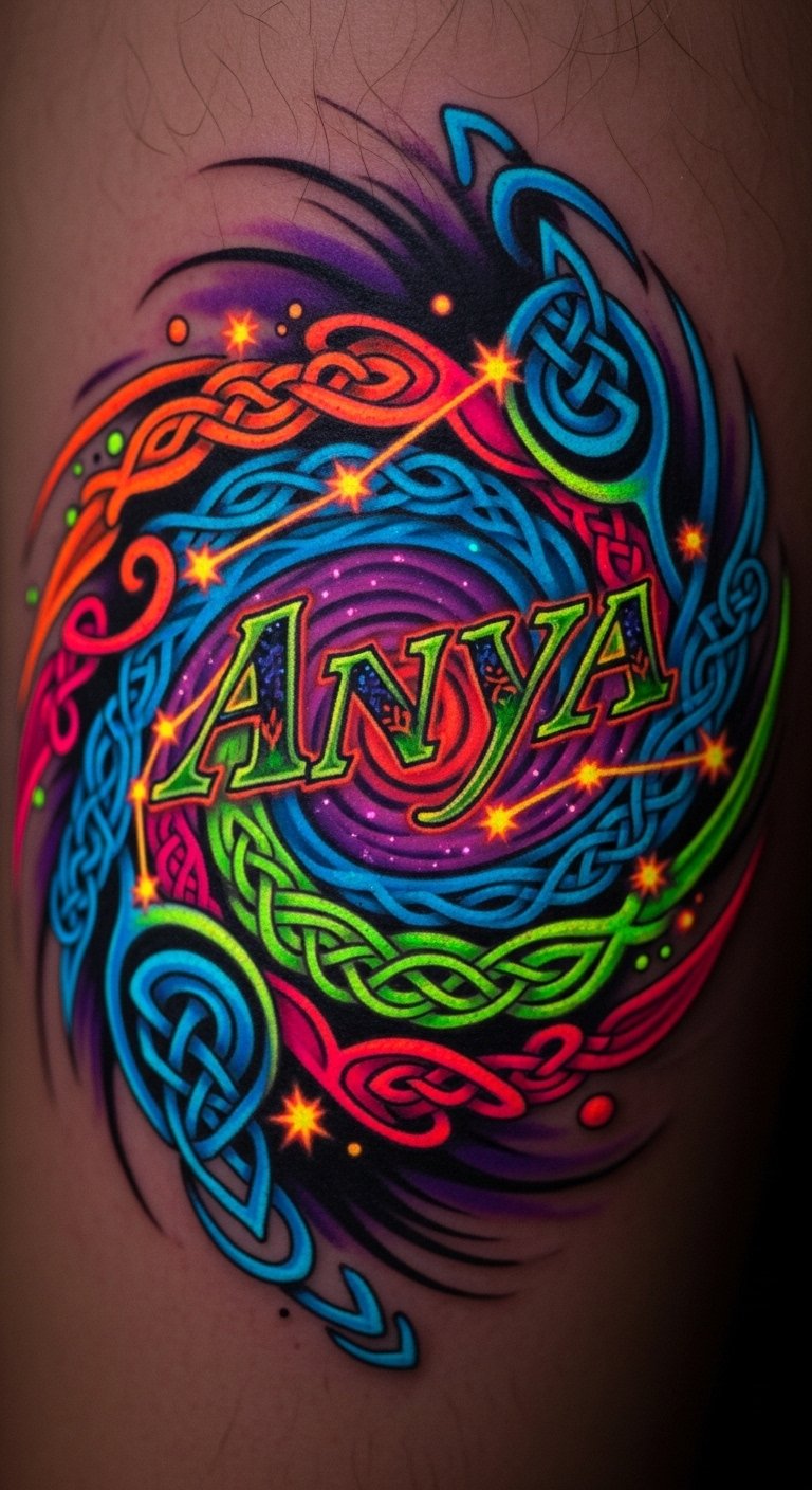 This design concept blends cosmic and floral motifs with layered UV-reactive inks to convey transformation and hidden depths; vibrant nebulae lines interweave with delicate glowing petals to evoke wonder and discovery, suggesting personal stories revealed only in specific light. Emotionally it celebrates curiosity, mystery, and quiet revelation—ideal for a forearm or upper back where movement exposes the glow; placement allows both private delight and public display under night settings, making the tattoo an intimate secret that comes alive in the dark.
