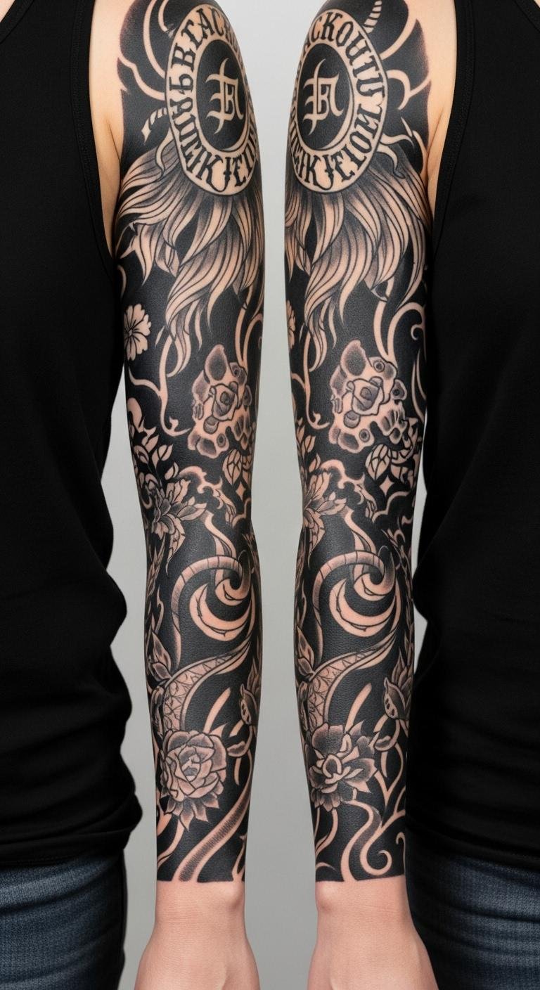 Choosing a black sleeve tattoo isn’t just about aesthetics; it’s a bold declaration of identity and style that resonates deeply with personal significance. The striking contrast of solid black ink draws on rich artistic influences and cultural significance, embodying strength and resilience. You embrace a timeless look that connects you to traditions, inviting admiration and inspiring freedom in self-expression. This design uses dense black fields to convey strength and permanence, negative-space botanicals to suggest growth and personal evolution, and geometric bands to represent structure and lineage; placed to flow from wrist to shoulder, the composition emphasizes arm movement, frames musculature, and leaves intentional skin-breaks for visual breathing, evoking resilience, pride, and quiet defiance.