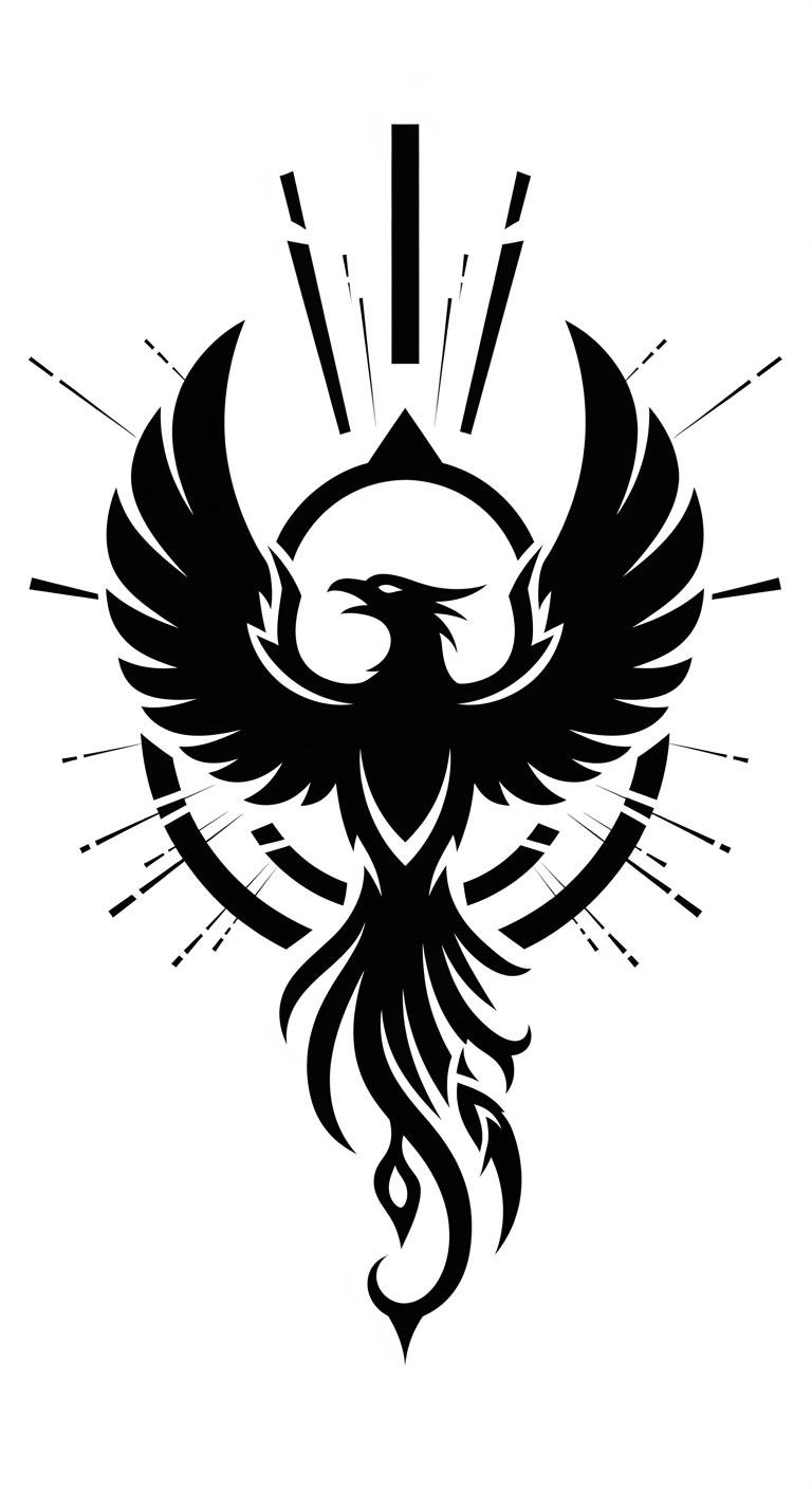 The phoenix symbolizes rebirth and inner strength, the solid black fills convey permanence and conviction, geometric framing adds structure to chaos, and negative-space feathers hint at growth; emotionally the piece reads as defiant renewal—ideal on the forearm for daily visibility or the upper back for a larger, emblematic statement.