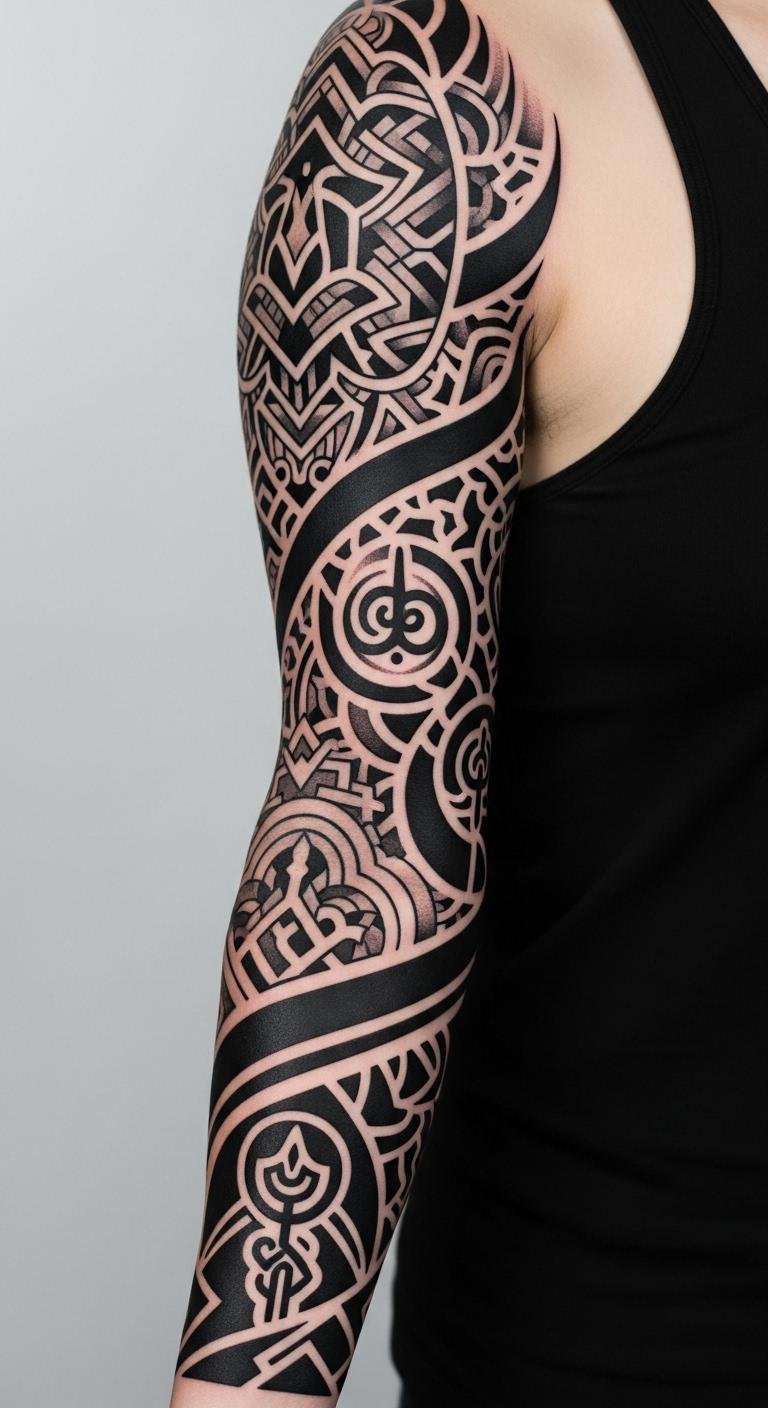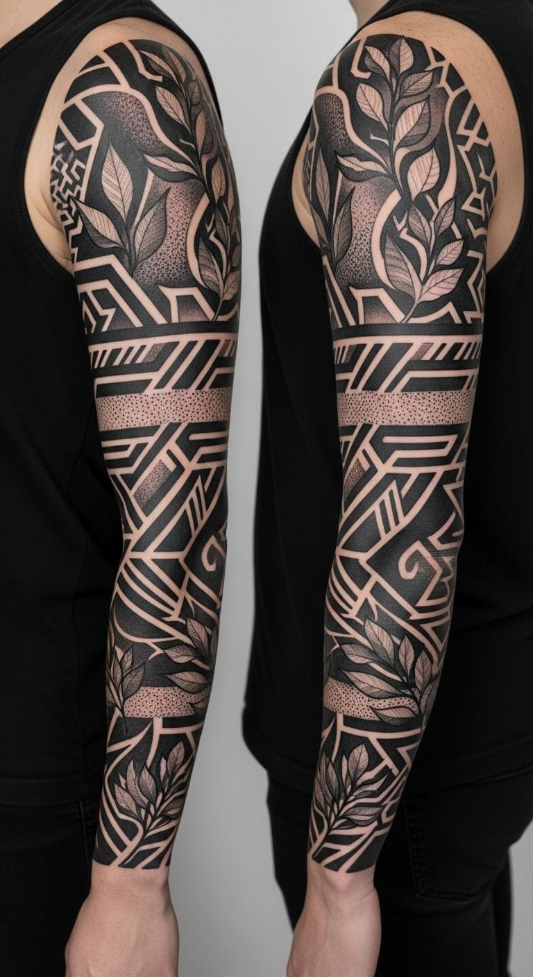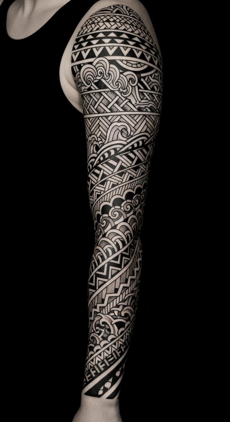 When placed as a full sleeve wrapping the upper and lower arm, the design blends flowing Polynesian motifs with stark geometric bands and negative-space highlights, symbolizing the interweaving of ancestry, personal trials, and modern identity; emotionally it evokes strength, continuity, and introspection, inviting both wearer and viewer to trace stories across the skin, and it sits best when tapered at the wrist and shoulder to follow natural muscle lines and movement.
