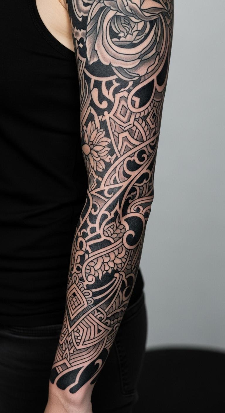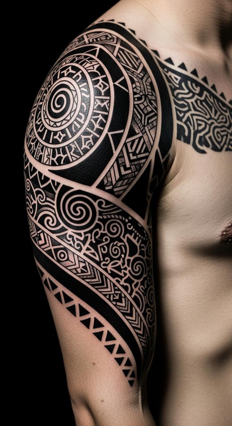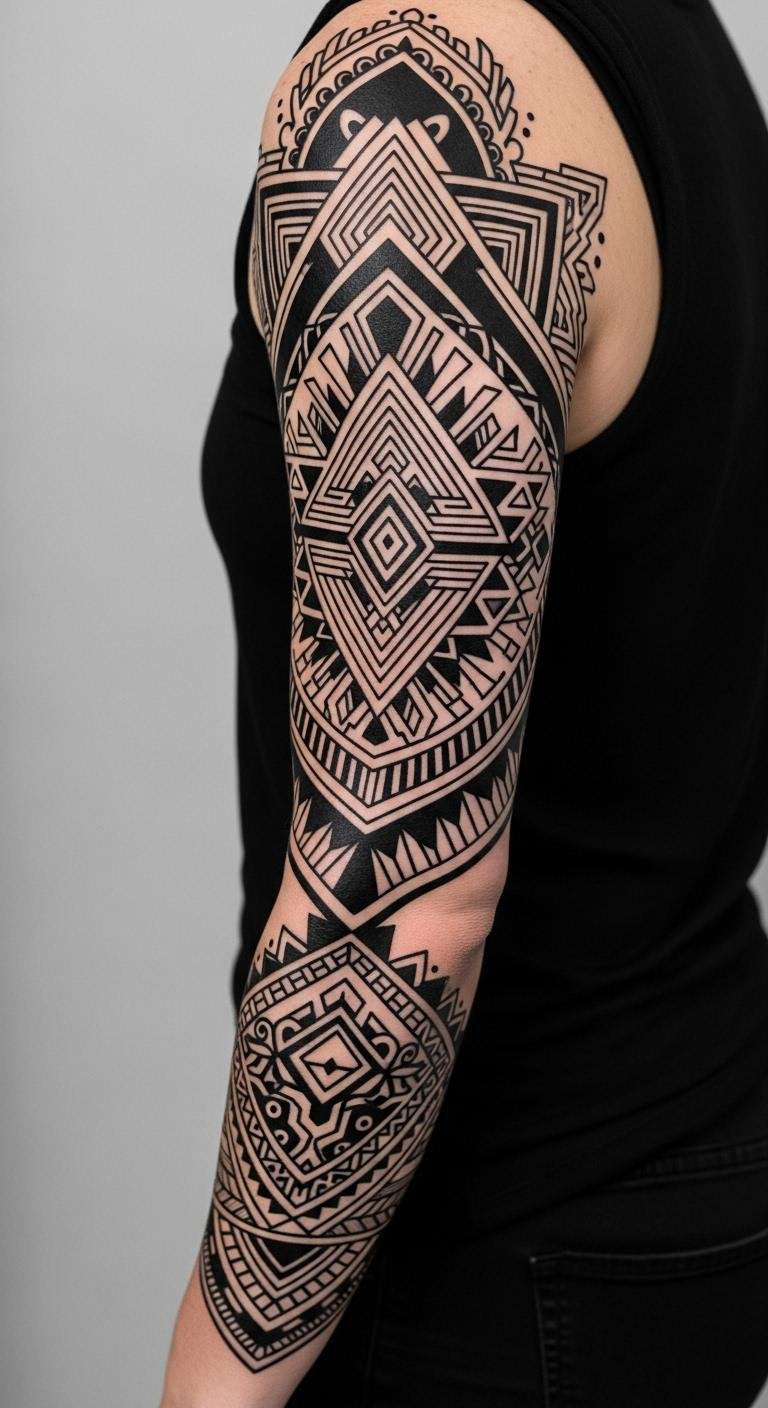 When placed as a full sleeve wrapping the upper and lower arm, the design blends flowing Polynesian motifs with stark geometric bands and negative-space highlights, symbolizing the interweaving of ancestry, personal trials, and modern identity; emotionally it evokes strength, continuity, and introspection, inviting both wearer and viewer to trace stories across the skin, and it sits best when tapered at the wrist and shoulder to follow natural muscle lines and movement.