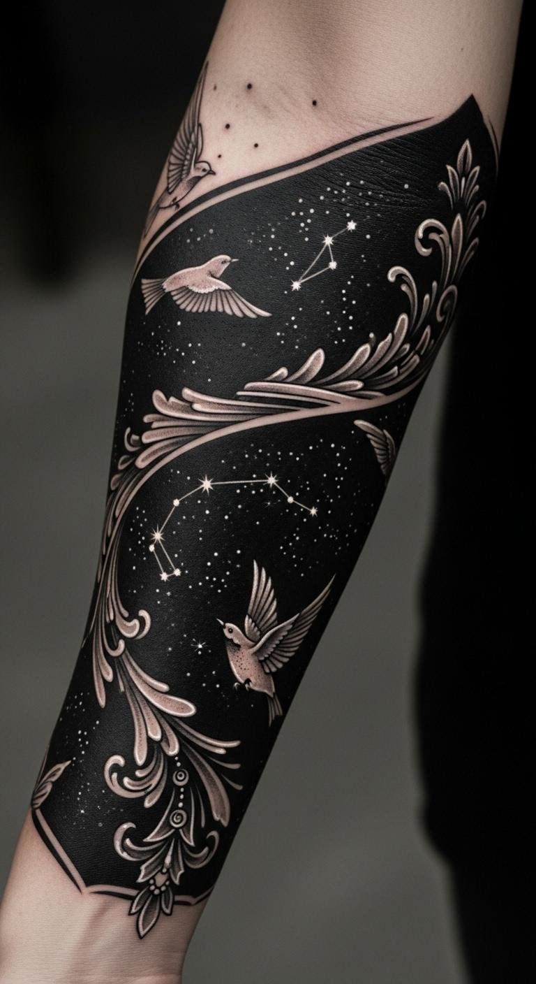This design combines a sweeping blackout field with carefully preserved negative-space silhouettes—birds in flight, a winding path, and layered geometric textures—to convey a narrative of emergence and perseverance. The dense black areas provide striking contrast to the delicate voids, creating depth and movement that evoke resilience and personal transformation. Ideal placements include the upper arm wrapping toward the shoulder, the calf, or a thoracic panel where the flow can follow musculature; the piece invites both bold display and intimate reflection depending on placement.