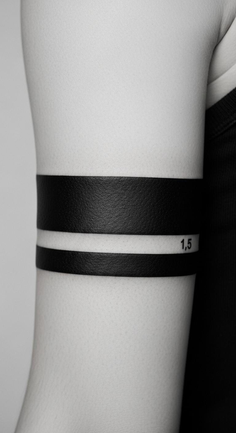 The design emphasizes resilience and cohesion—the thicker band as grounding force, the thinner band as personal nuance—evoking calm confidence and quiet resolve; best placed on the upper arm where muscle contours enhance its clean geometry and visibility can be adjusted by rotation or sleeve length.