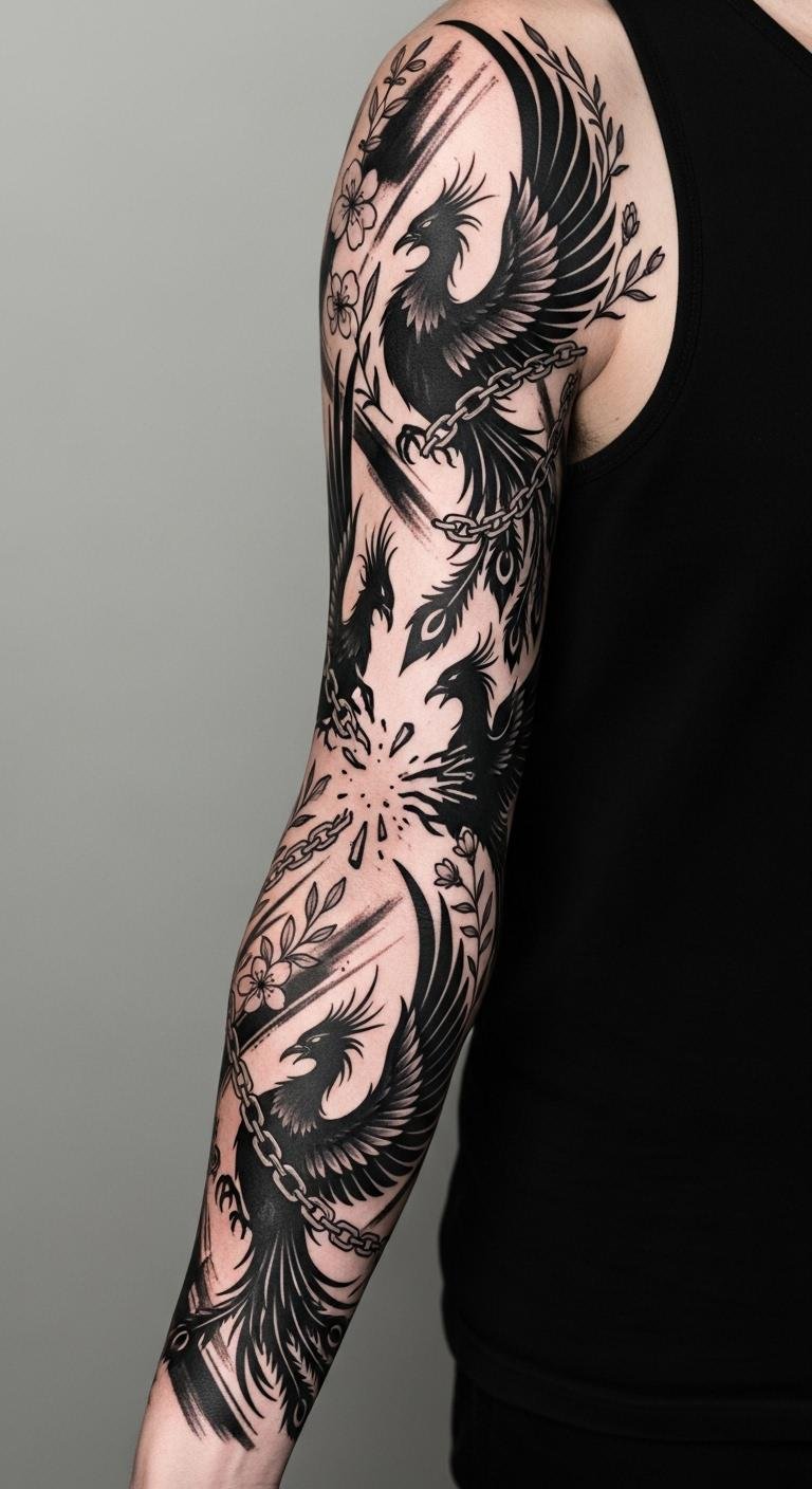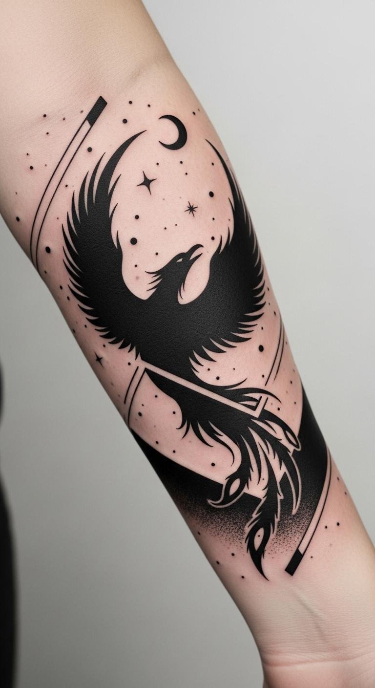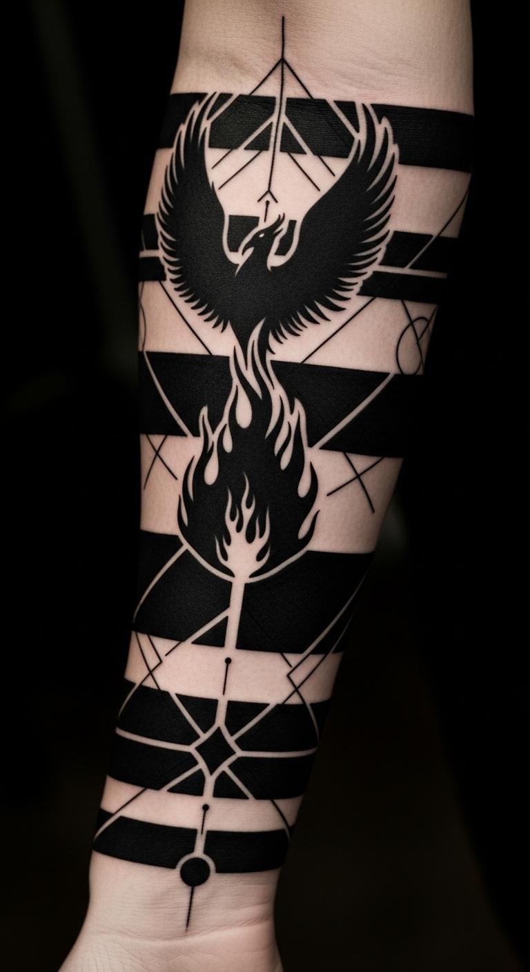 This design uses the phoenix silhouettes and negative space to symbolize rebirth emerging from darkness, the geometric lines to suggest structure and control, and the flowing skin-vein gaps to evoke personal history and vulnerability; placed on the forearm it remains visible for daily affirmation yet concealable when desired, inviting both private reflection and outward proclamation of resilience.