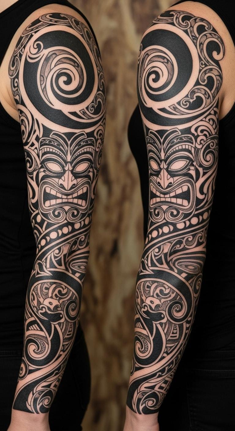 Place the sleeve to flow with the arm’s natural curves—koru spirals at the shoulder for growth, mangopare along the forearm for courage, and tiki motifs near the inner wrist as guardians; the design evokes reverence, pride, and protective strength while maintaining respectful, personal connection to ancestral themes.