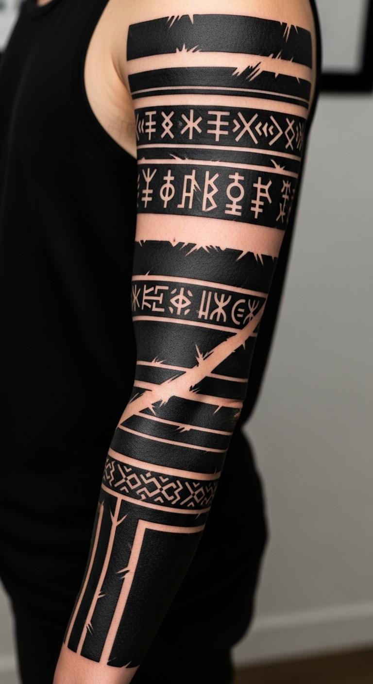 Rendered in deep black with intentional negative space, the design evokes solemn pride and timeless resilience. Best placed as a full arm sleeve wrapping from shoulder/upper arm down to the wrist, curves should follow muscle contours for natural movement and visibility of key symbols on the outer arm and forearm.