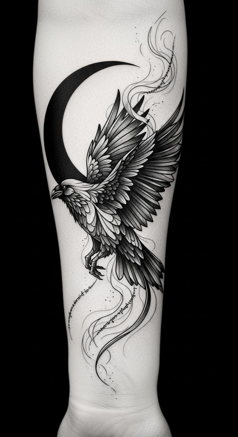 The crescent moon and raven symbolize the marriage of intuition and intelligence, while the flowing geometric lines and filigree suggest hidden structure beneath apparent chaos; smoke and script-like markings represent unspoken stories and emotions that trail into the unseen.