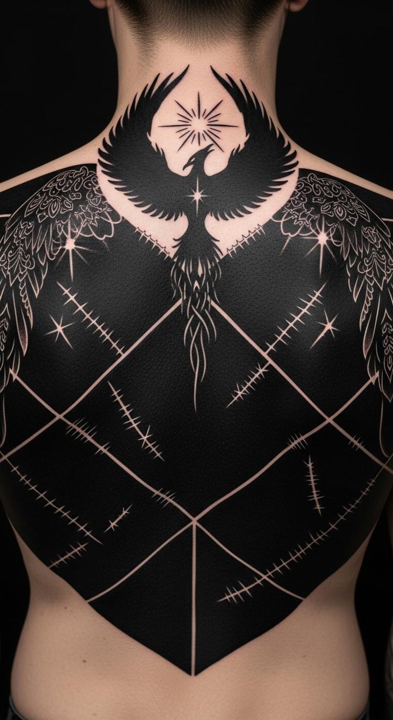 Place this design across the upper back and shoulders so the blackout panels act as a protective cloak while the phoenix in negative space centers along the spine, the stitched-line motifs tracing former wounds, and the filigree peeking over the collarbones to convey emergence, renewal, and visible reclamation of one’s story.