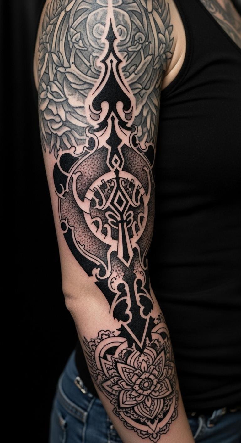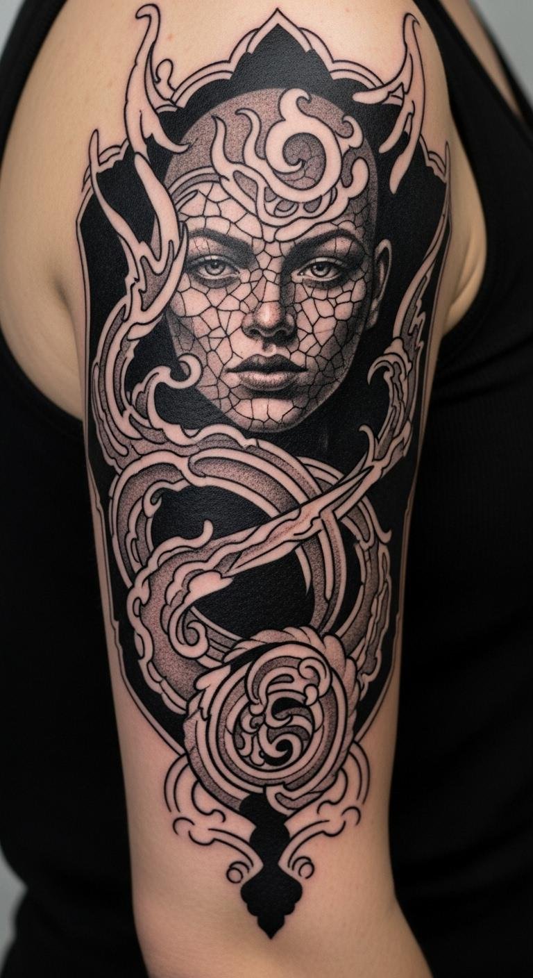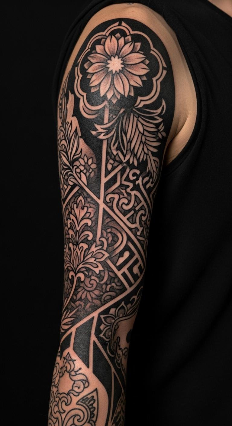 The design uses the weight of blackout areas to symbolize collective memory and protection, while the detailed motifs and negative space express personal narrative and continuity; placed wrapping the upper arm onto shoulder and chest, it accentuates movement and body form, evoking reverence, resilience, and confident self-expression.