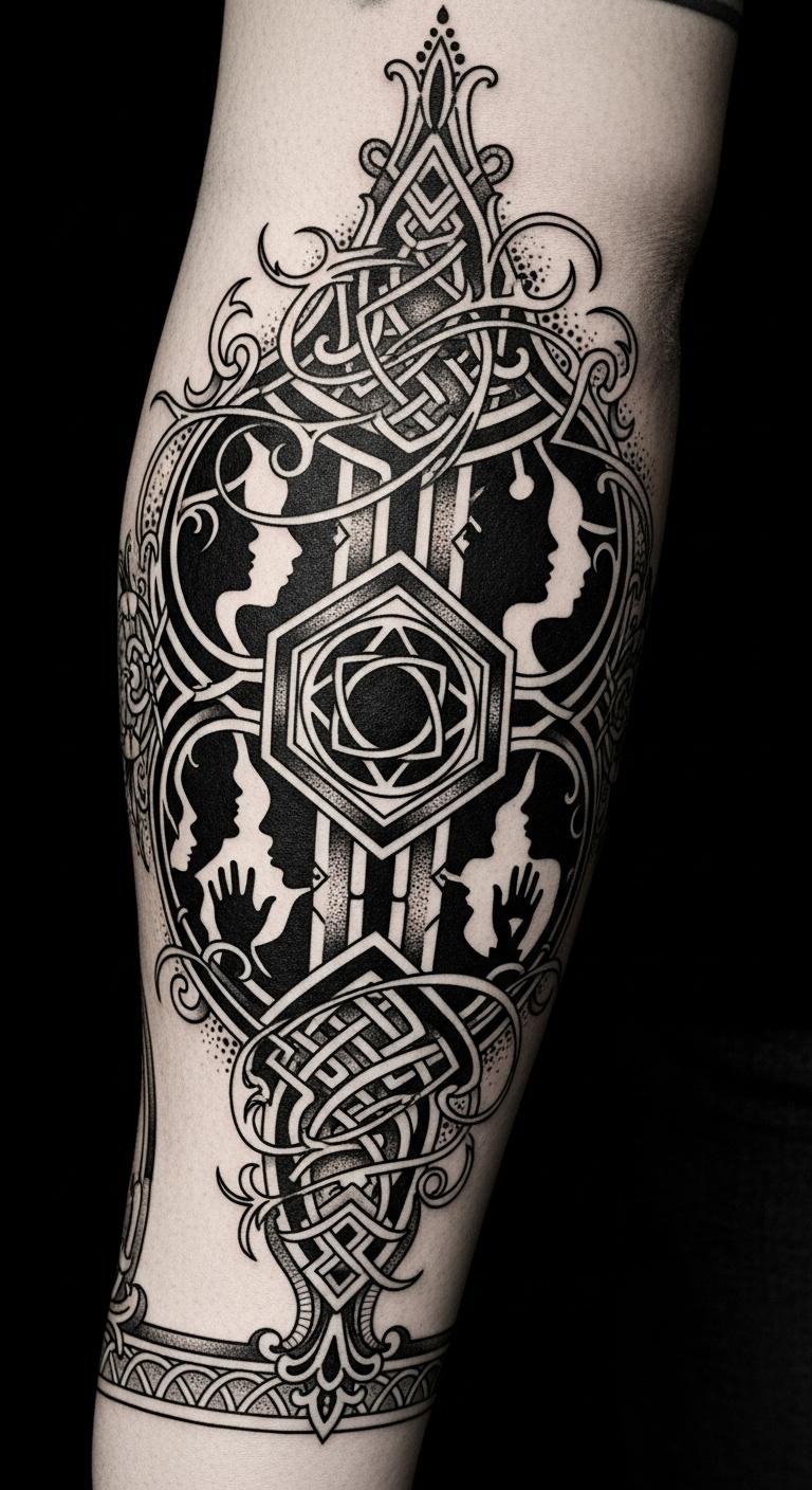 Through modern interpretations, you explore identity, embracing aesthetic meanings while honoring the cultural significance and design evolution rooted in heritage storytelling. This placement and composition aim to evoke continuity between past and present: the geometric emblem anchors lineage, the woven patterns represent community and memory, the hidden faces and hands suggest inherited stories and human connection, and the monochrome palette emphasizes solemn respect and timelessness—ideal for visibility on a forearm to invite conversation or on the upper back as a personal altar of identity.