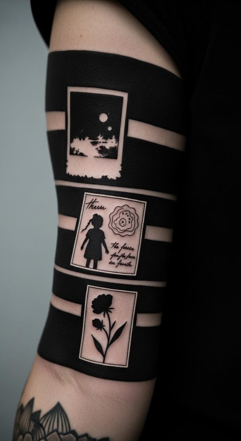 Place on the upper arm wrapping into a sleeve so each negative-space memento aligns with moments of the body—near the heart for intimate memories, along the outer forearm for stories shared publicly—symbolizing layers of grief, protection, and reclaimed identity while the stark black contrasts with skin to emphasize what remains.