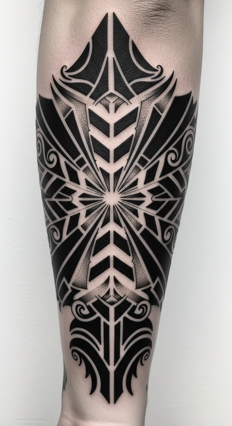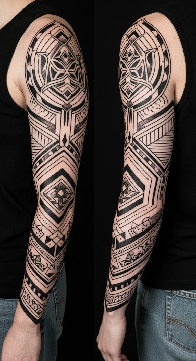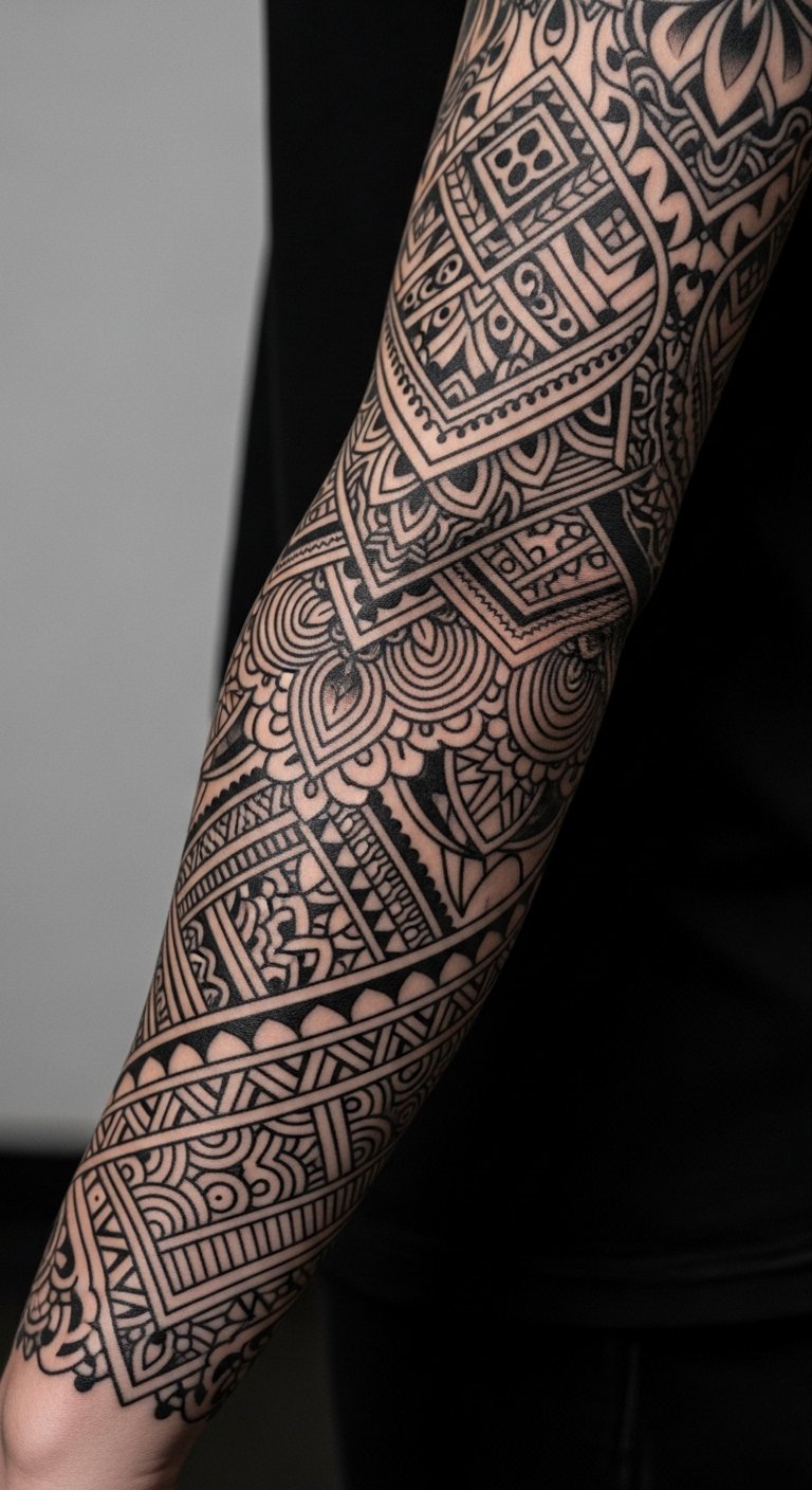 A sweeping blackwork sleeve centered on sharp geometric crescents and bold negative-space florals that balance dense ink with bare skin; heavy, rhythmic bands anchor the design at shoulder and wrist while a cluster of cultural motifs—stylized mandala, tribal linings, and a singular, abstracted crest—sits over the outer forearm. Symbolically it marries strength (the solid blacks) with personal narrative (the unique motifs), evoking resilience, heritage, and creative freedom; emotionally it reads as confident and contemplative. Ideal placement is a full or half sleeve to allow the contrasts and flowing elements to interact with muscle movement, or a large back piece for maximum visual impact.