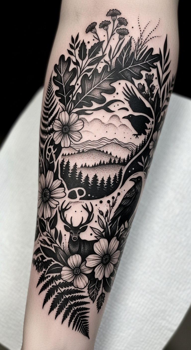 This design concept channels reverence for the wild: oak leaves and ferns symbolize strength and resilience, wildflowers bring quiet renewal, the stag represents nobility and inner guidance, and the raven hints at mystery and transformation.