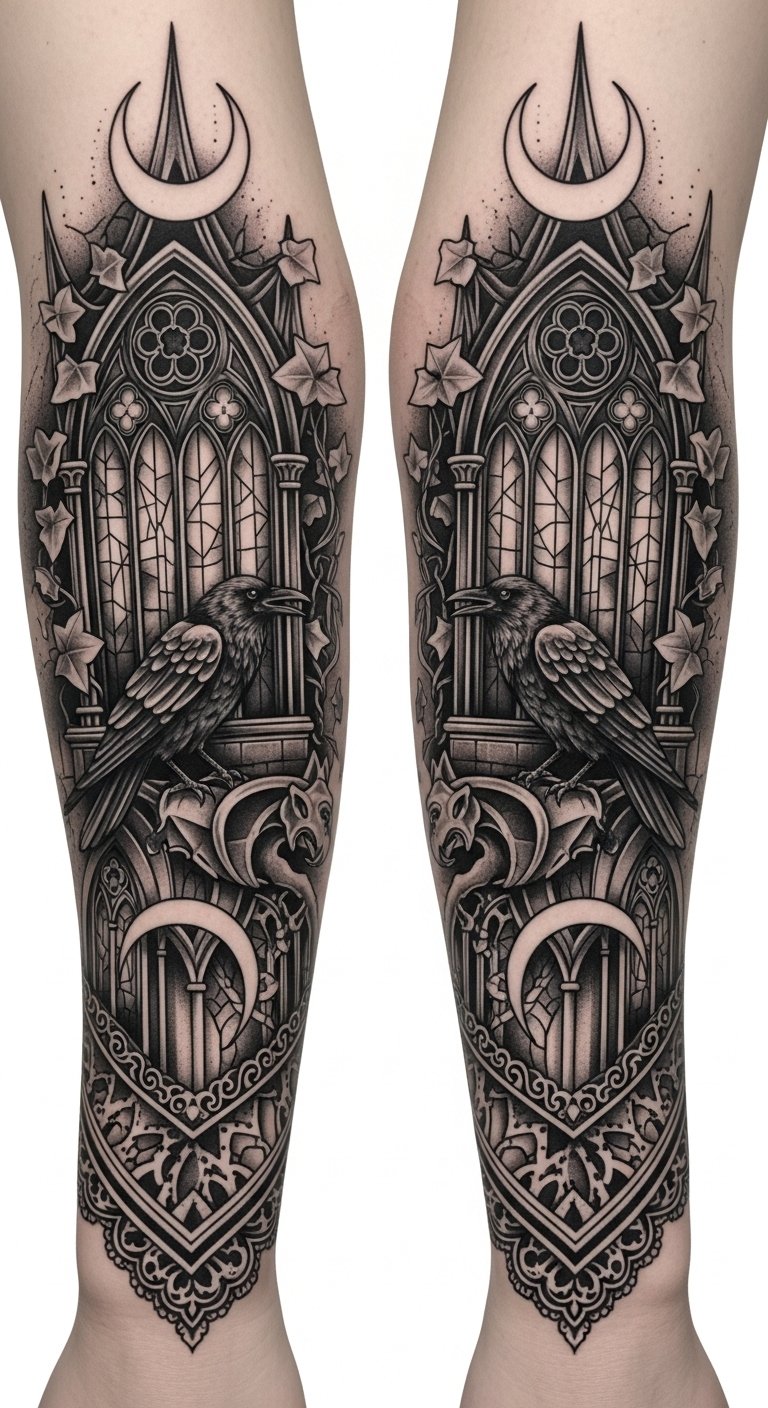 Each tattoo captures the essence of the mystical and macabre, inviting you to embrace your individuality and express your passion for the enigmatic world that awaits. This design channels those themes: the raven and gargoyle suggest vigilance and protection, the arches and buttresses convey endurance and solemn grandeur, while the ivy and crescent moons add cyclical life and hidden mystery.