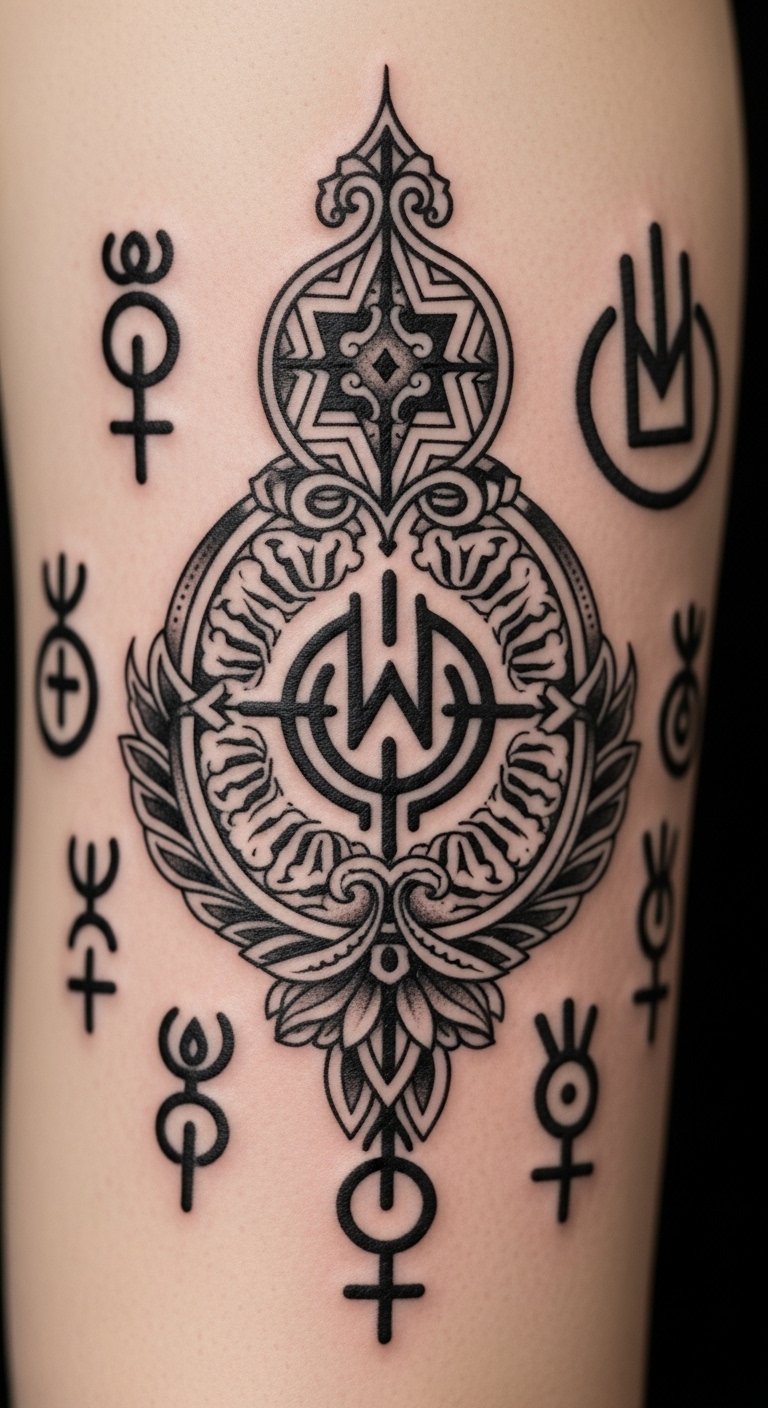 Symbols weave a rich tapestry of meaning in the domain of blackwork tattoos, each design carrying its own unique story and significance. You’ll discover ancient symbols with deep cultural significance, hidden messages that resonate with your identity representation, and power symbols that forge emotional connections. These tattoos transcend mere ink, embodying personal stories and spiritual meanings rooted in historical traditions, enriching your journey towards freedom. The design concept layers interlocking geometric motifs and emblematic icons—an ancient knotwork band transitions into a central totem combining a crescent, sigil-like rune, and an open eye rendered in dense blackwork; negative space forms subtle initials or a personal glyph. Emotionally the piece conveys rooted heritage, inner revelation, and empowerment; placement along the forearm or down the side of the ribcage allows the wraparound composition to read as both private sigil and public statement, adaptable in scale to maintain detail and balance with the body’s contours.