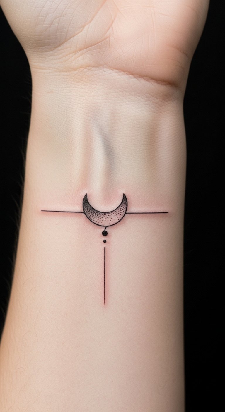 The crescent encircling the dot symbolizes protection and focus—an intimate talisman suggesting calm and centeredness; the continuous line conveys unity and personal continuity, while negative space highlights restraint and quiet strength.