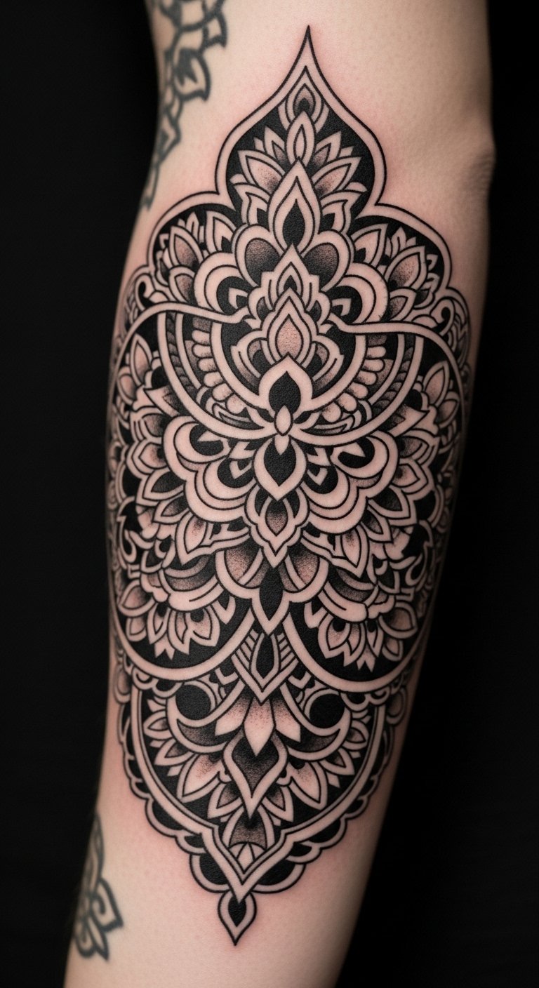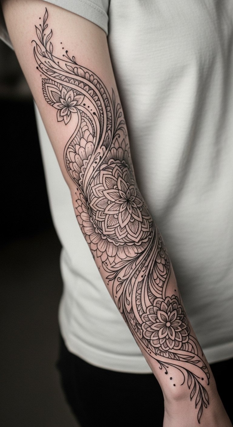 With each stroke, you embrace your freedom of expression, transforming your style into a fascinating masterpiece. The design symbolizes personal growth and interconnectedness—mandalas for inner harmony, filigree for layers of experience, and vines for continuous change—evoking contemplation and quiet confidence; emotionally it feels meditative and empowering, suited to a forearm placement where the wraparound flow reads both as a private narrative and a visible statement, with curvature chosen to enhance muscle movement and tactile engagement.
