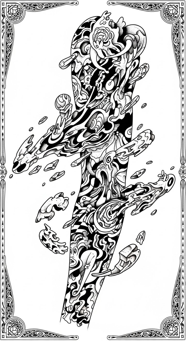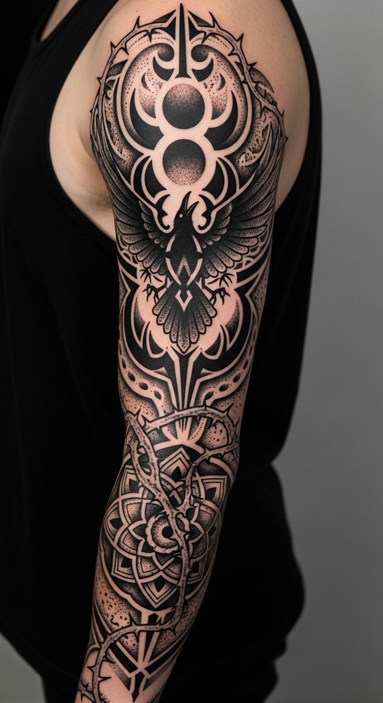 Immerse yourself in this creative journey, and let your sleeve reflect the freedom you crave. The concept centers on sweeping black bands and interlocking geometric motifs that flow from shoulder to wrist, punctuated by voided areas forming symbolic figures—an abstract phoenix emerging from negative space, roots wrapping the inner forearm, and bold mandala anchors at elbow and shoulder.
