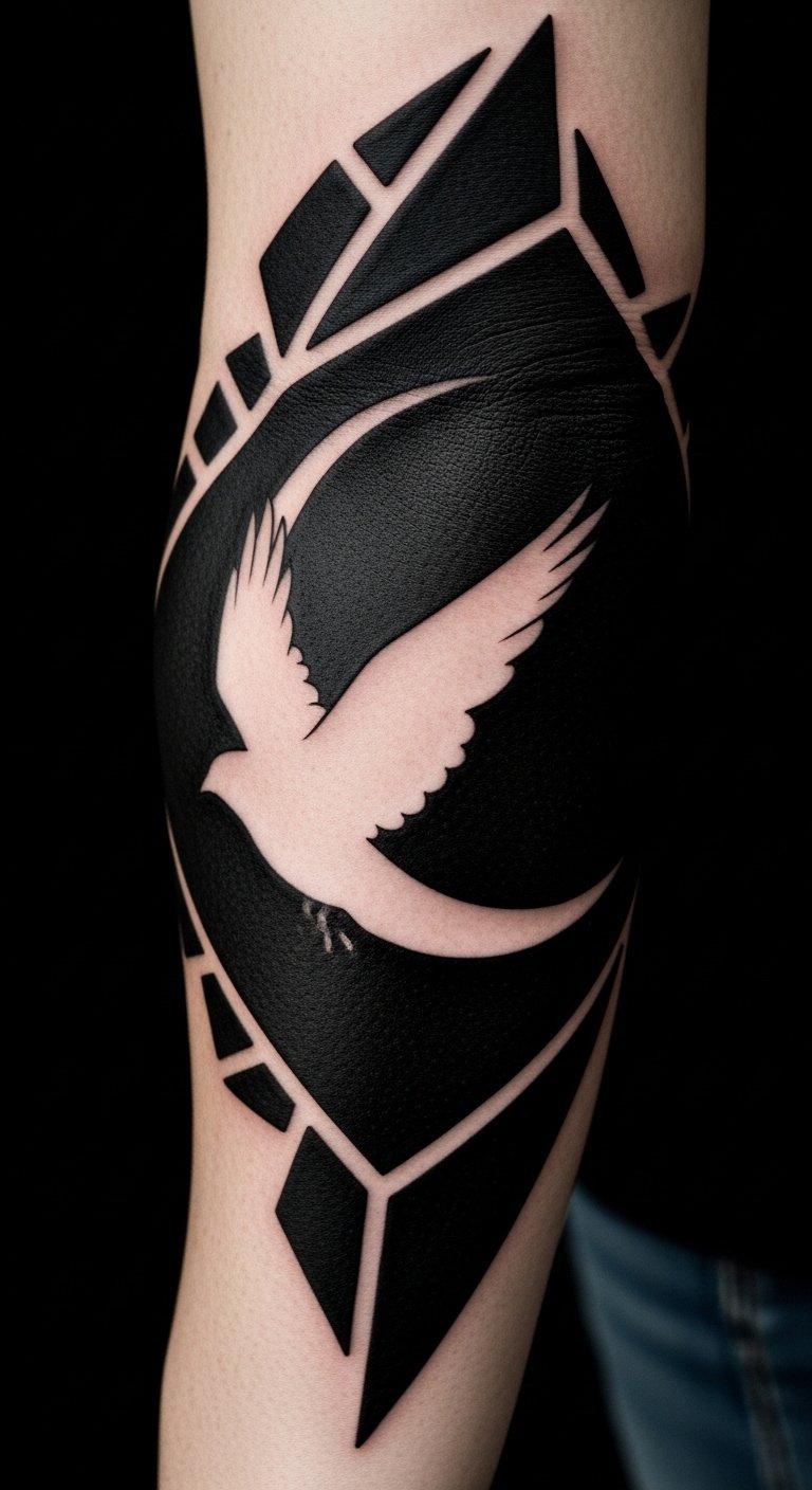 Ideal placement is a full forearm or upper arm sleeve where the sweeping crescent aligns with muscle contours, allowing movement to animate the bird motif while the solid black areas create a striking, wearable silhouette.