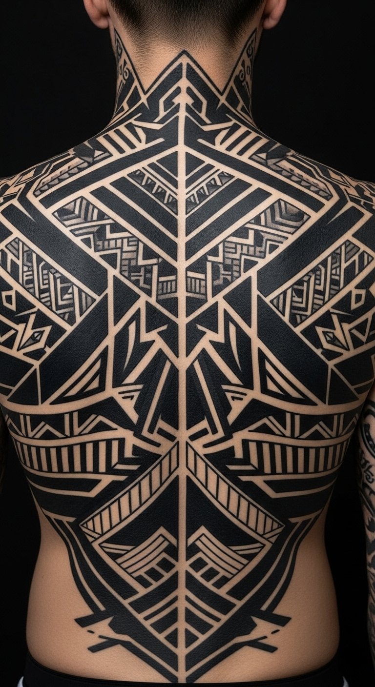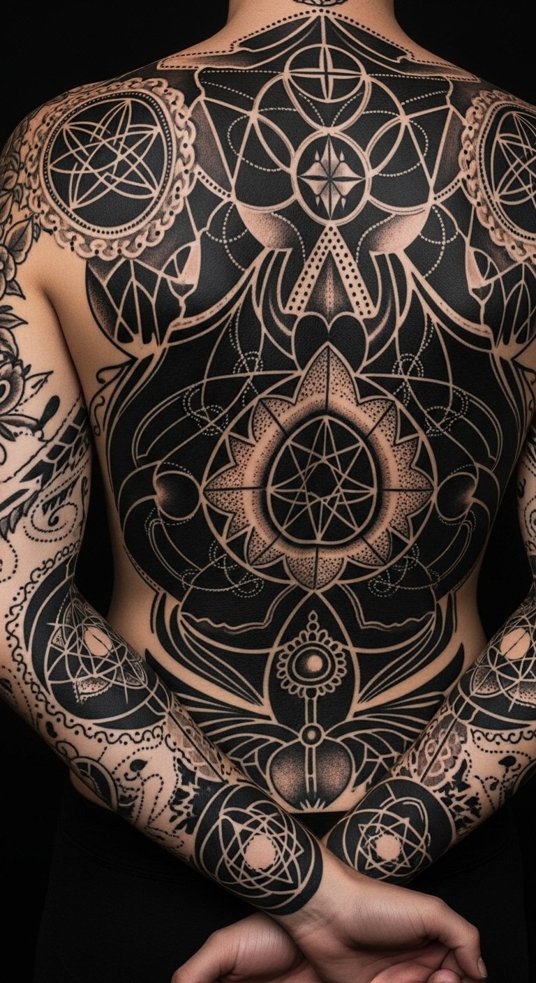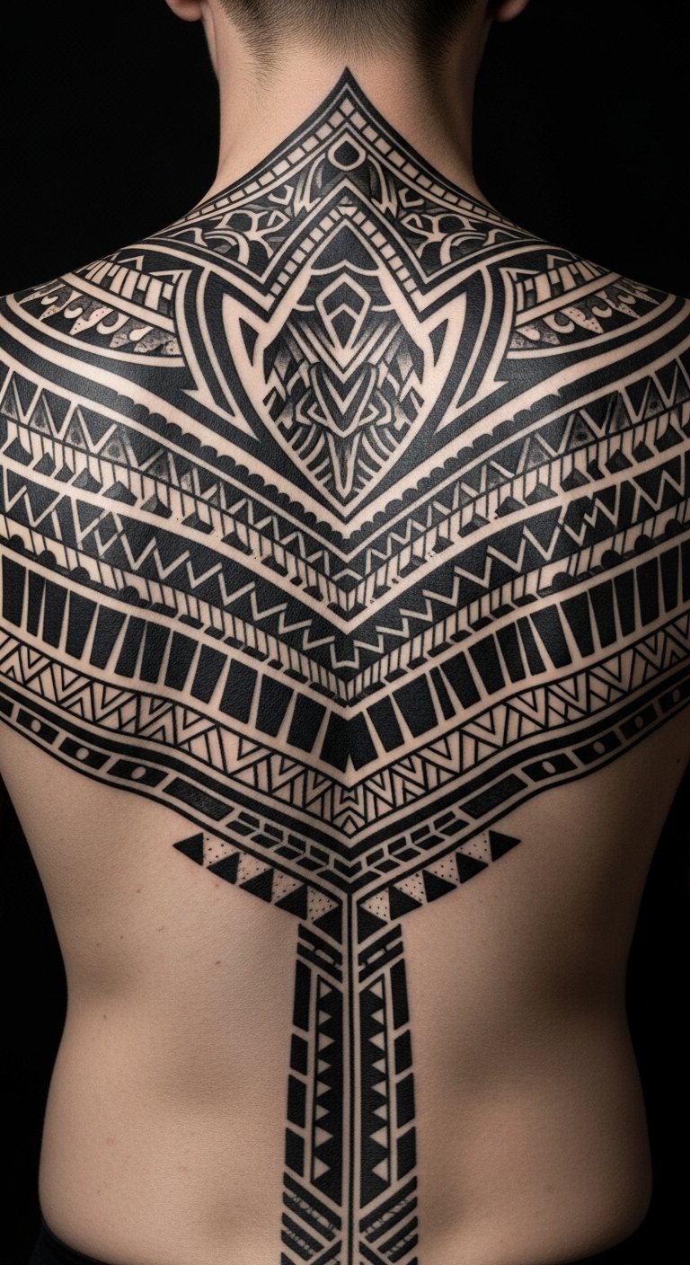 This design concept centers a bold, symmetrical blackwork motif spanning from the sternum across the chest and expanding into an intricate, layered composition down the spine and across the upper back.