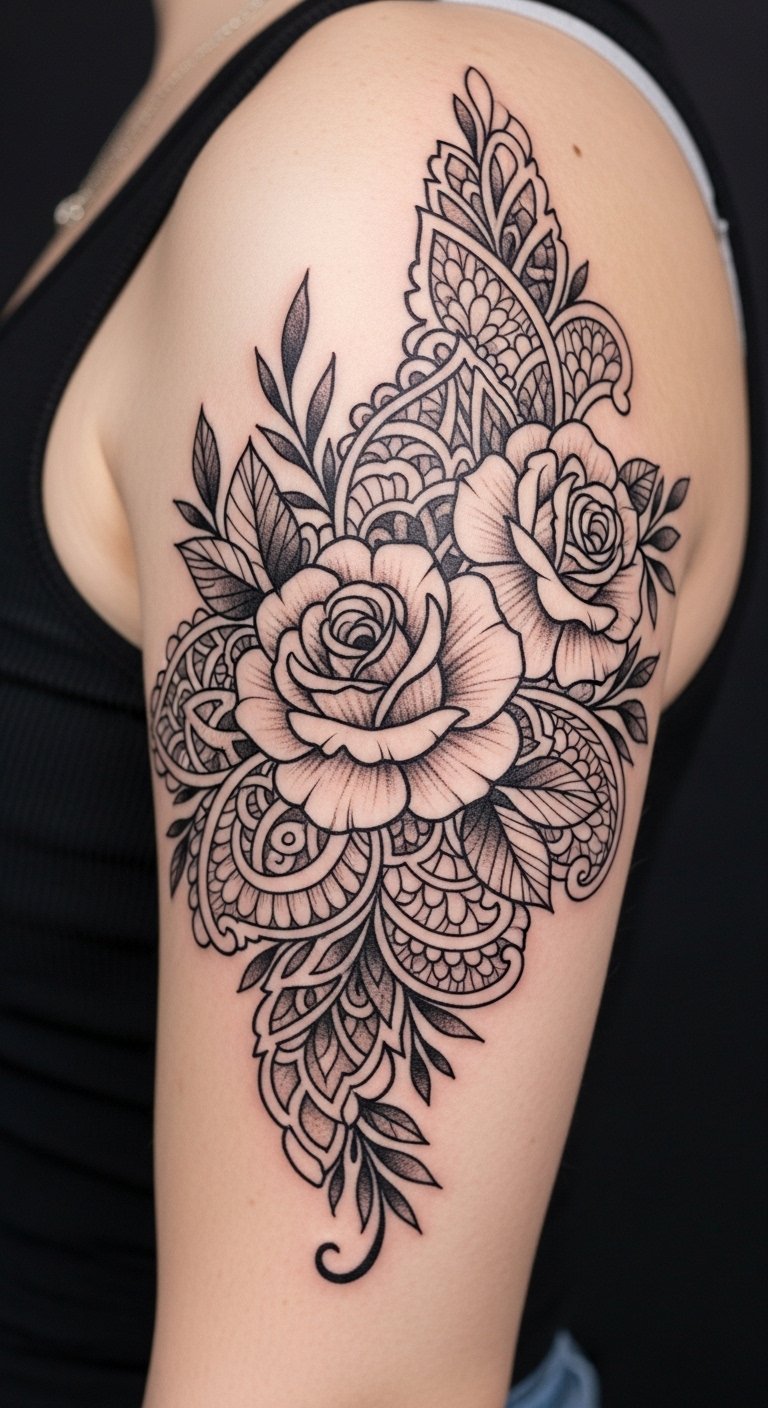 The dense black fills and fine-line detailing create contrast and depth, evoking strength and introspection; floral and geometric elements interlace to symbolize growth and harmony, while mirrored symmetry reflects balance and self-coherence.