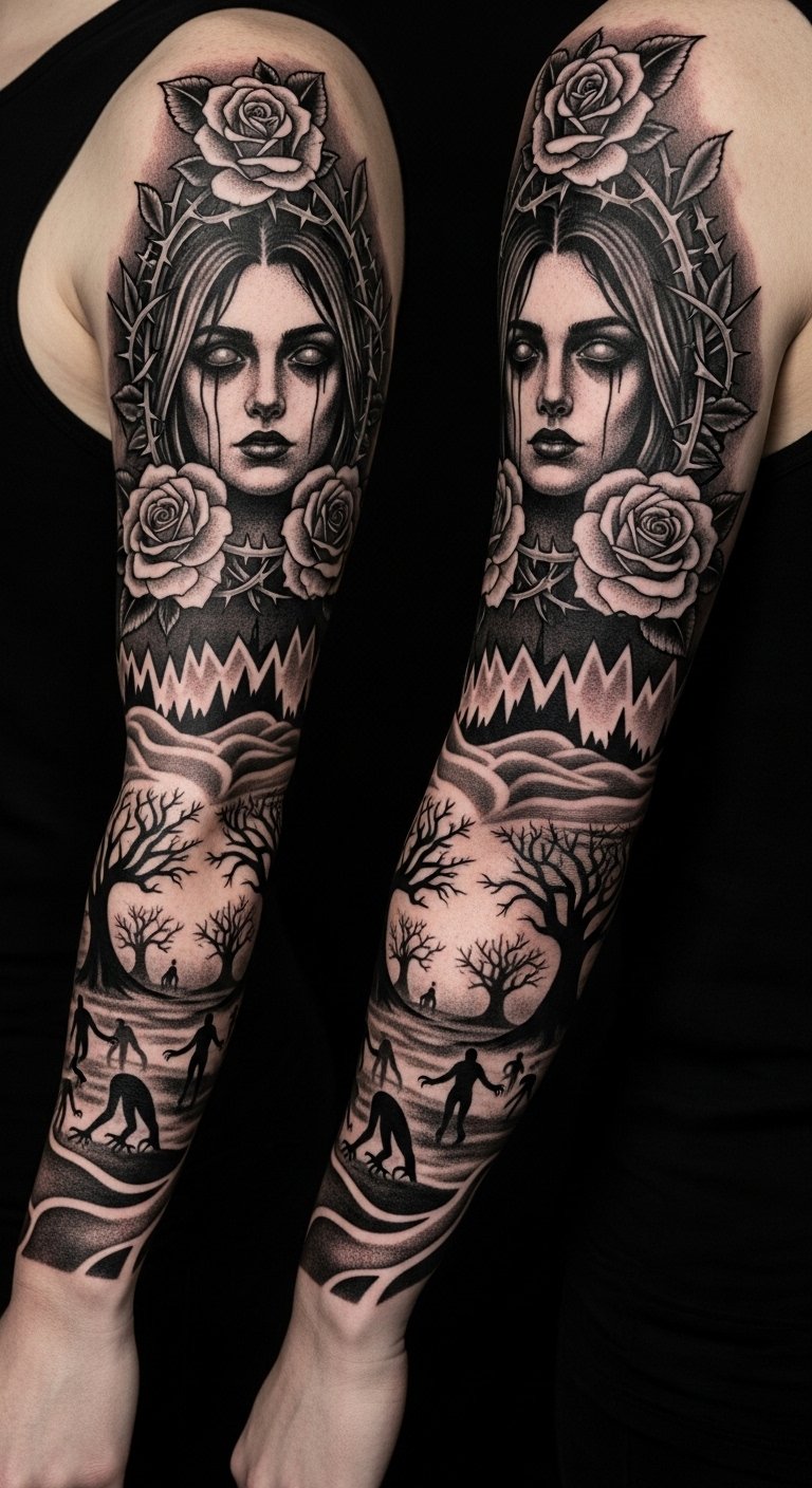 These tattoos embrace gothic horror and nightmarish themes, reflecting your love for spooky aesthetics and allowing your wild spirit to shine. The design symbolizes the duality of beauty and terror—roses and thorns entwined with haunted vistas—evoking feelings of fascination, defiance, and melancholic wonder; ideal for a forearm or upper arm placement where the composition can wrap and reveal details as the wearer moves.