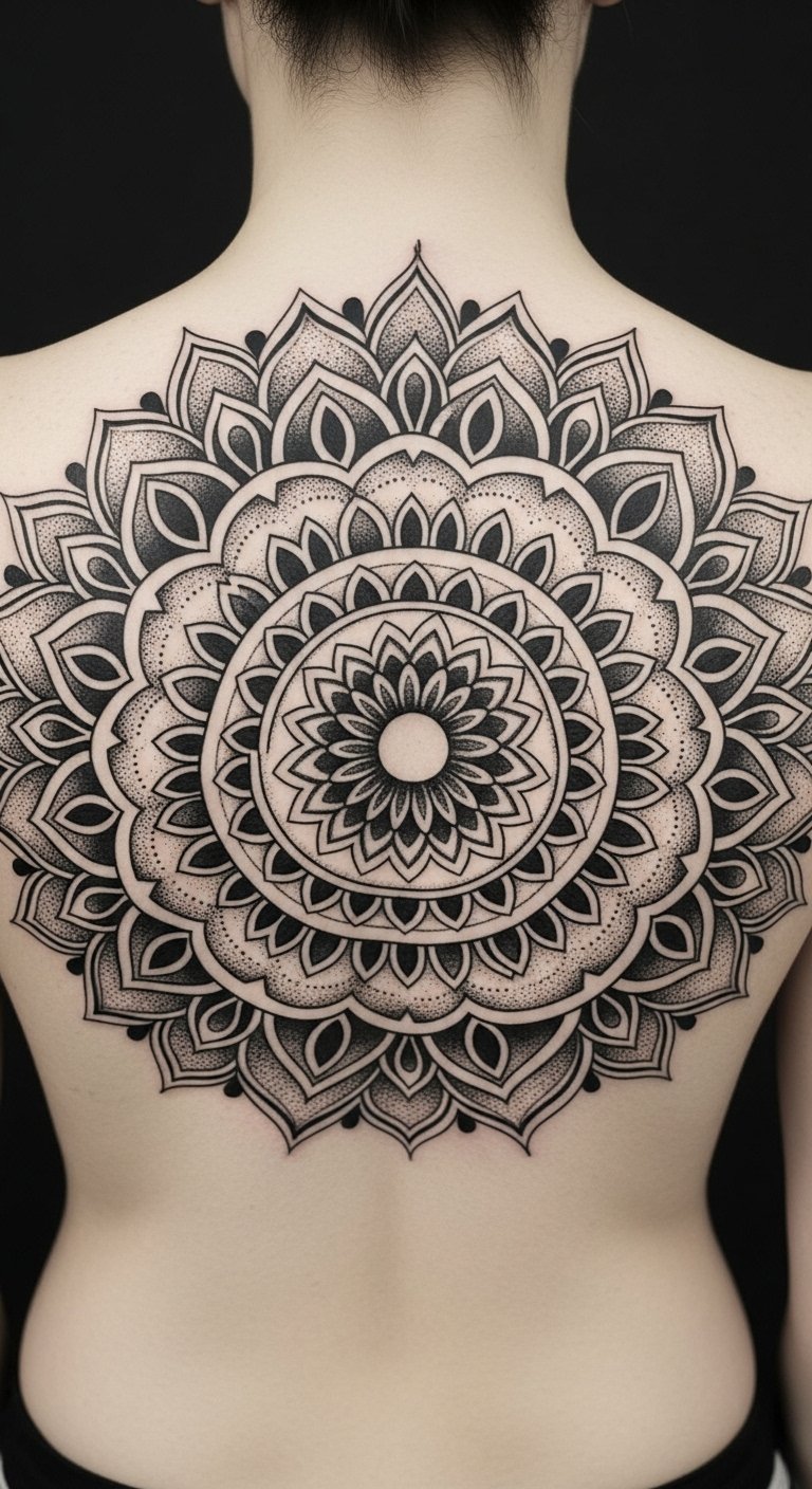 The combination of fine dotwork and bold black shapes evokes calm focus and resilient strength, intended to inspire contemplation and a sense of harmonious selfhood.