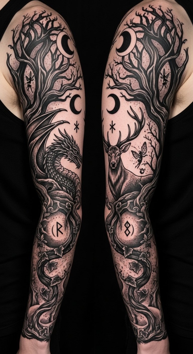 Placement as a full or half sleeve allows the composition to flow with the arm, wrapping scenes around the biceps and forearm so each turn reveals new details and narrative layers.