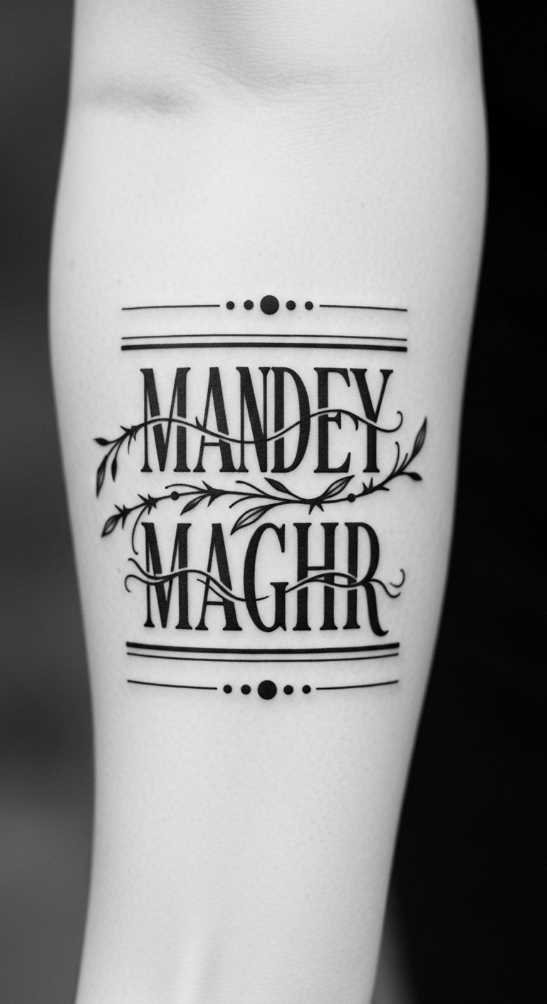 This concept uses stark blackwork lettering to emphasize clarity and permanence, the ornamental rules and dot clusters guiding the eye and lending rhythmic punctuation to the words; the barbed vine behind the text suggests growth and protection, a tension between vulnerability and strength.