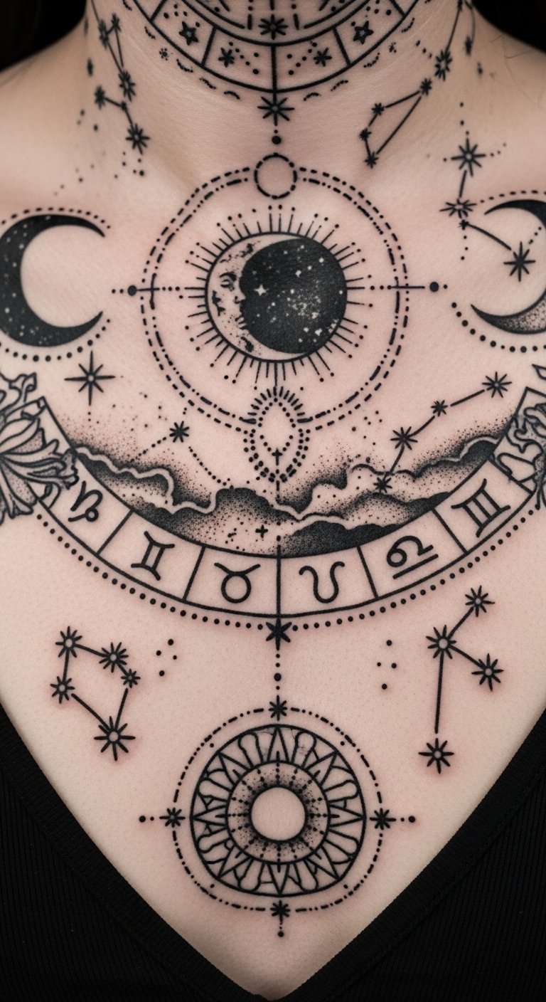 Constellations and stars as blackwork form a flowing sleeve or shoulder piece, where dense dotwork backgrounds and bold linework constellations create depth and movement; moons, tiny starbursts, and zodiac glyphs act as focal points.