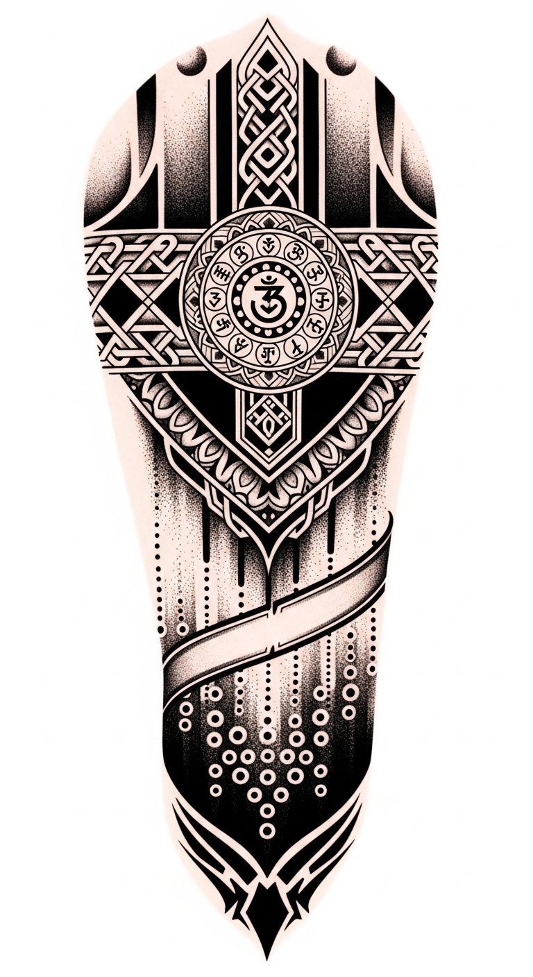 This design concept uses the central mandala as an emotional anchor—calm, introspective, and reverent—while the surrounding tribal linework conveys strength and lineage; stippling and negative space create breath and movement, allowing personal symbols or script to be integrated into the banner strip.
