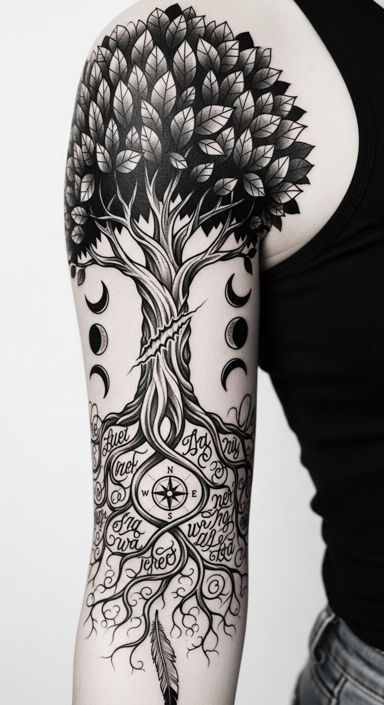 A bold forearm piece: a central silhouetted tree with dense, stippled roots fading into geometric negative-space patterns, surrounded by bands of ornamental blackwork filigree that echo personal motifs from the original text—individual symbols hidden within the branches; the overall composition balances heavy black fills and fine line textures to evoke resilience, identity, and liberation. Place on the inner forearm or along the ribs to allow the piece to read intimately, conveying personal narrative and emotional depth while remaining a striking public statement when revealed.