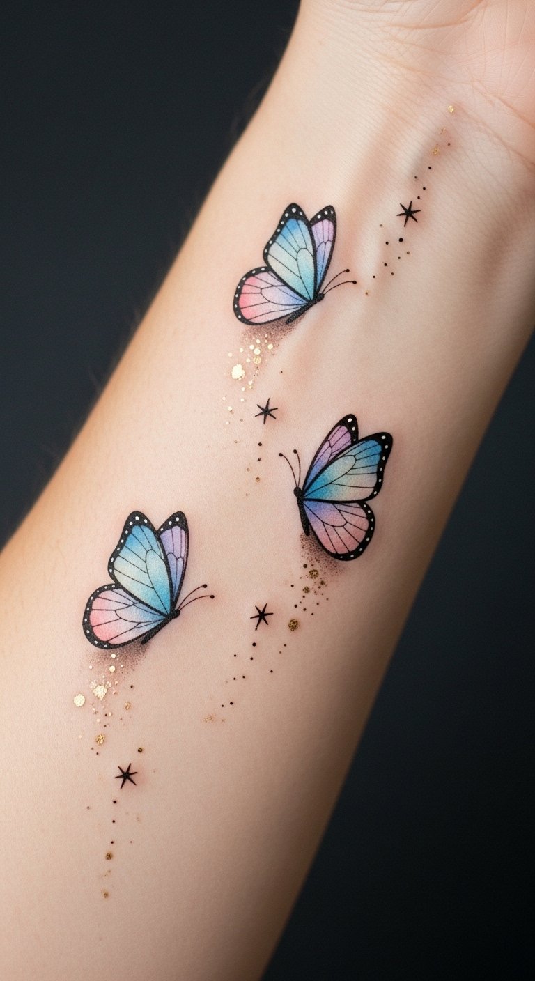 Adorn your body with these enchanting creatures, and feel your confidence soar. This design emphasizes metamorphosis and hope through soft watercolor tones and upward motion, evoking calm resilience and joyful rebirth; placement along the forearm or collarbone lets the butterflies appear in flight when the wearer moves, creating an intimate visual narrative that feels both personal and liberating, suitable for someone marking a major life change or seeking a daily reminder to embrace growth.