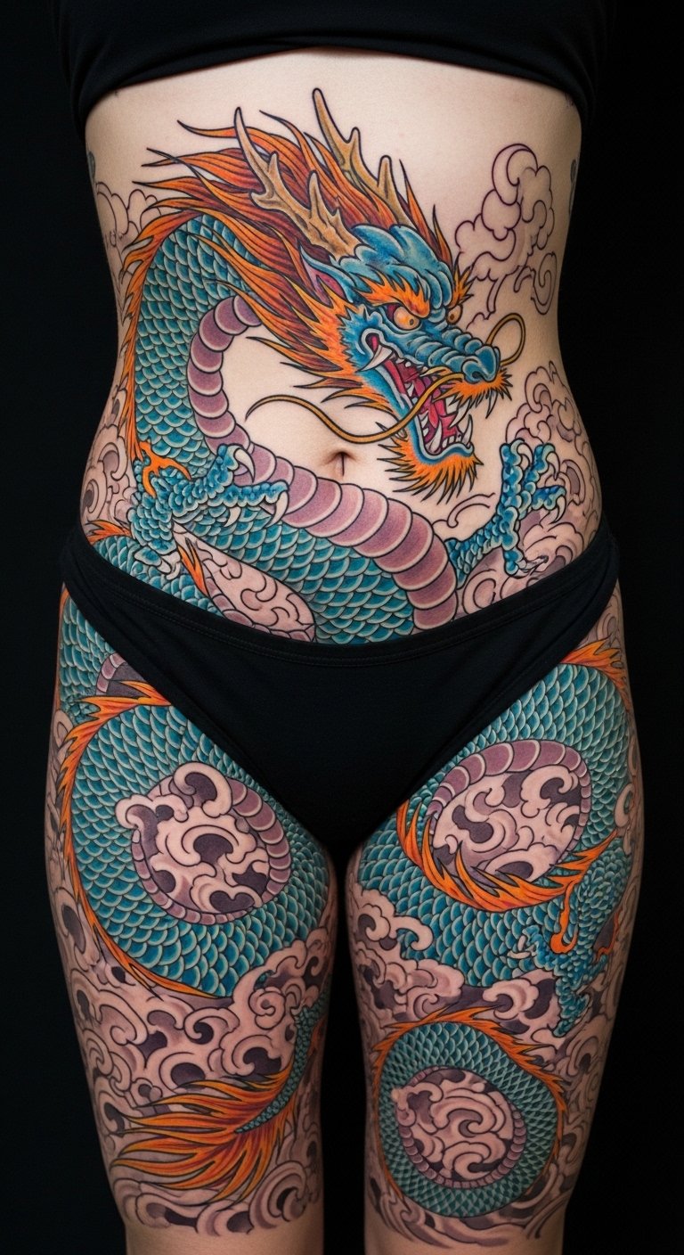 This concept channels the original text’s imagery into a design that wraps a bold, coiling dragon around the ribs or thigh, scales rendered in vibrant gradients and sharp, confident linework to emphasize strength and majesty. Symbolically it represents power, freedom, and the inner warrior; emotionally it evokes confidence and fierce self-acceptance. Placement along curves—ribcage, side torso, hip, or thigh—uses body movement to animate the dragon, while color and scale detail personalize the piece to the wearer’s untamed spirit.