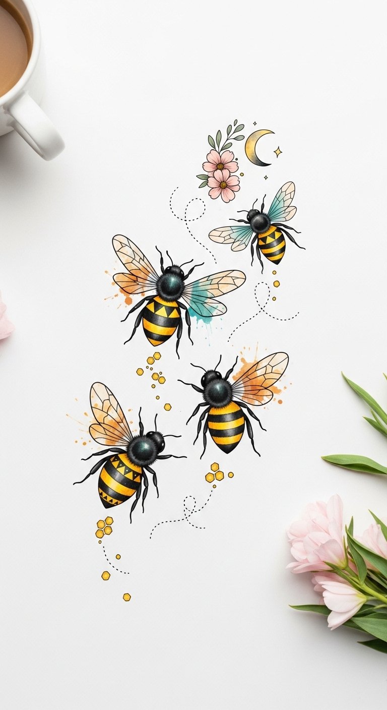 The design symbolizes industriousness, community, and the sweetness of life; emotionally it conveys warmth, playfulness, and quiet strength. Ideal placements include the forearm for visibility and storytelling, the shoulder for a balanced decorative motif, or the ribcage for a more intimate, personal reminder.