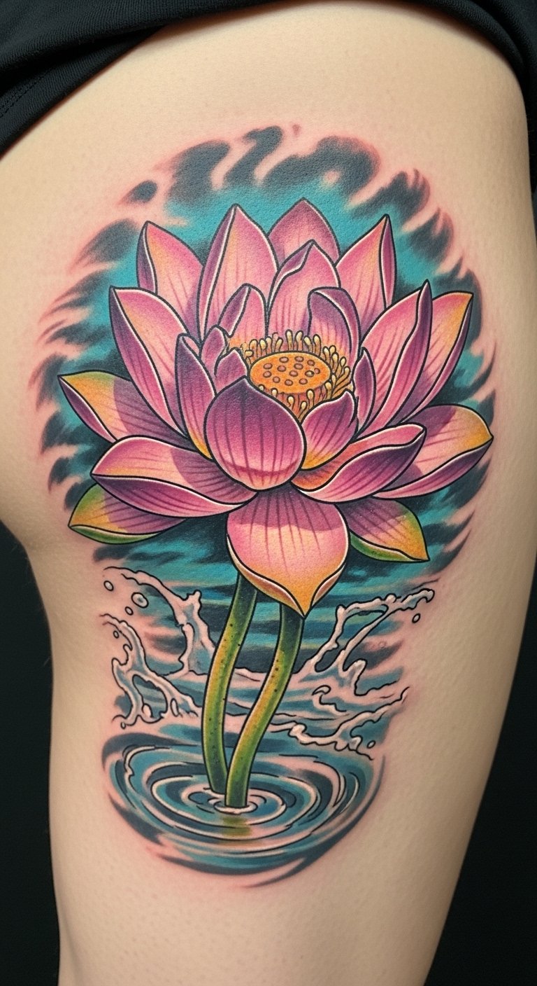 Lotuses rising from murky waters convey resilience and emergence; placing this design on the lower back frames the spine, suggesting inner balance, while the thigh offers a larger canvas for vivid colors and fine linework that emphasize petals unfolding.