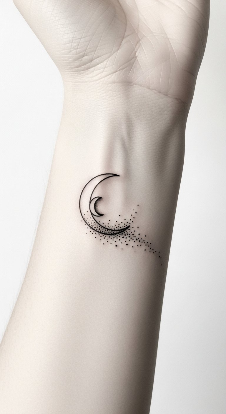 A minimalist crescent with a subtle dot trail evokes quiet resilience and gentle transformation; its simplicity allows personal interpretation—mystery for some, serenity for others—while the small scale and clean lines make it appropriate for intimate placements like the inner wrist, behind the ear, or along a collarbone where it can be easily shown or kept private.