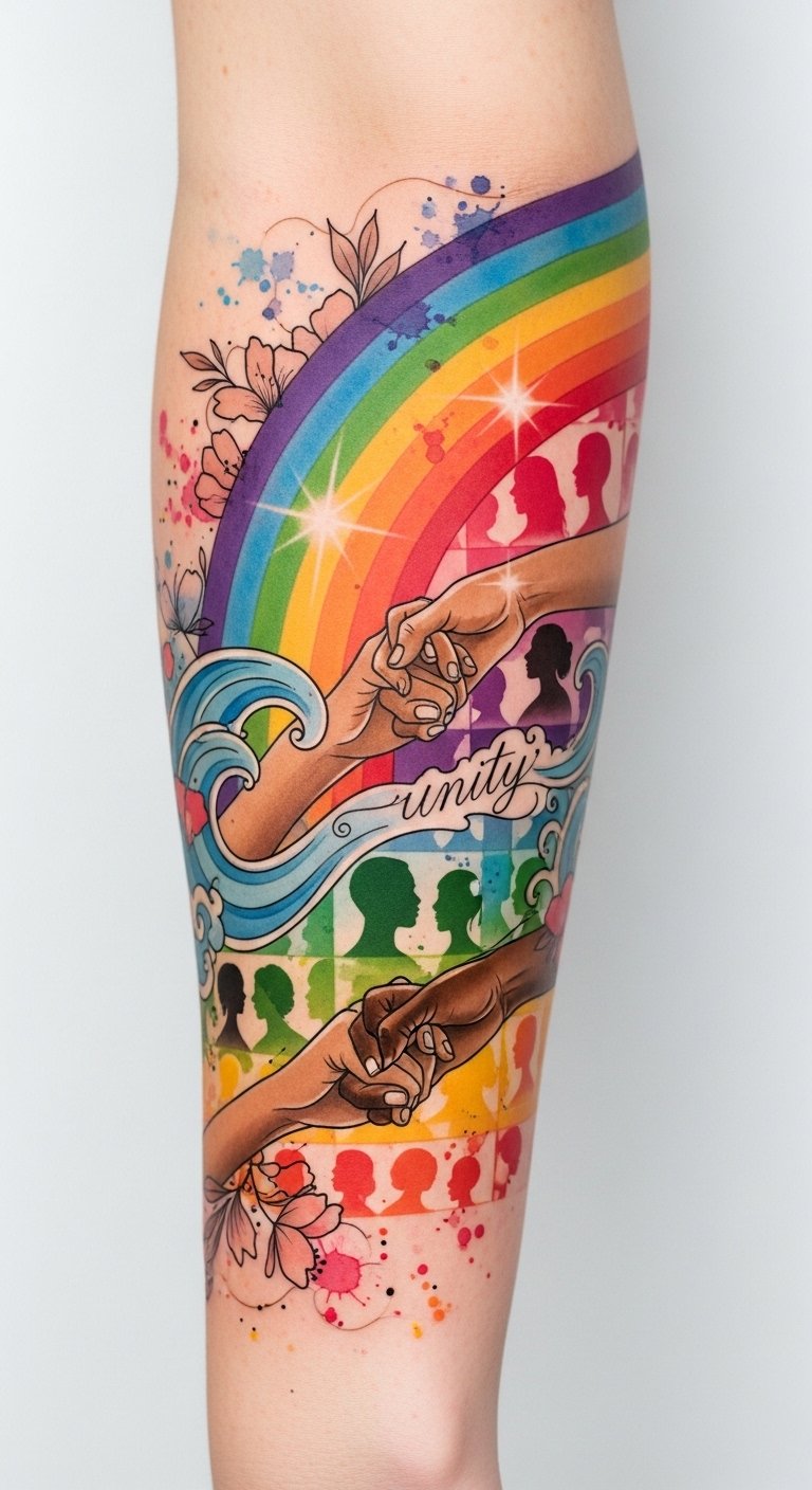 When you choose a rainbow tattoo, you’re not just expressing art; you’re embodying diversity representation, showcasing your commitment to love, acceptance, and the power of unity. This design uses the arc of the rainbow as a unifying bridge above interlocking hands and varied silhouettes to symbolize solidarity and shared experience; watercolor splashes convey joy and emotion, while fine-line details and script personalize intent.
