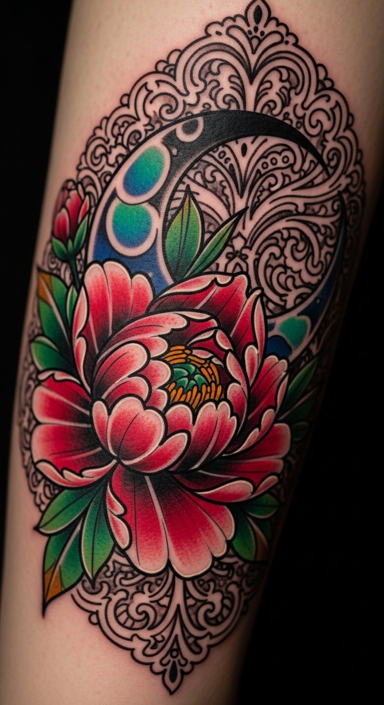 A neo-traditional peony and crescent moon placed on the upper gluteal curve uses bold lines and saturated jewel tones to celebrate beauty and resilience. The peony symbolizes honor and prosperity while the moon evokes cycles and intuition; the filigree frames the composition to enhance movement with the body, creating an intimate, empowering piece that feels both timeless and personal.